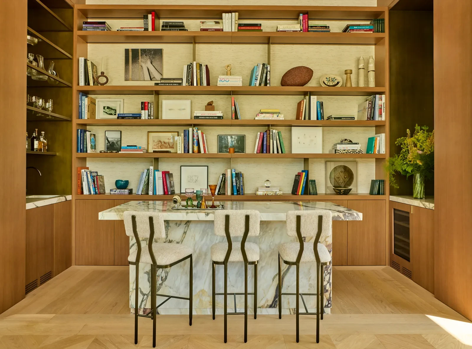 Το μαρμάρινο τζάκι και το bar προσθέτουν κομψότητα και λειτουργικότητα, ενώ οι επιφάνειες σε δρυ και ταβερτίνι προσδίδουν αίσθηση σταθερότητας και βάθους. Η σύνθεση των έργων τέχνης με την αρχιτεκτονική γραμμή δημιουργεί ένα χώρο όπου η αισθητική και η λειτουργικότητα συνυπάρχουν με φυσικότητα.