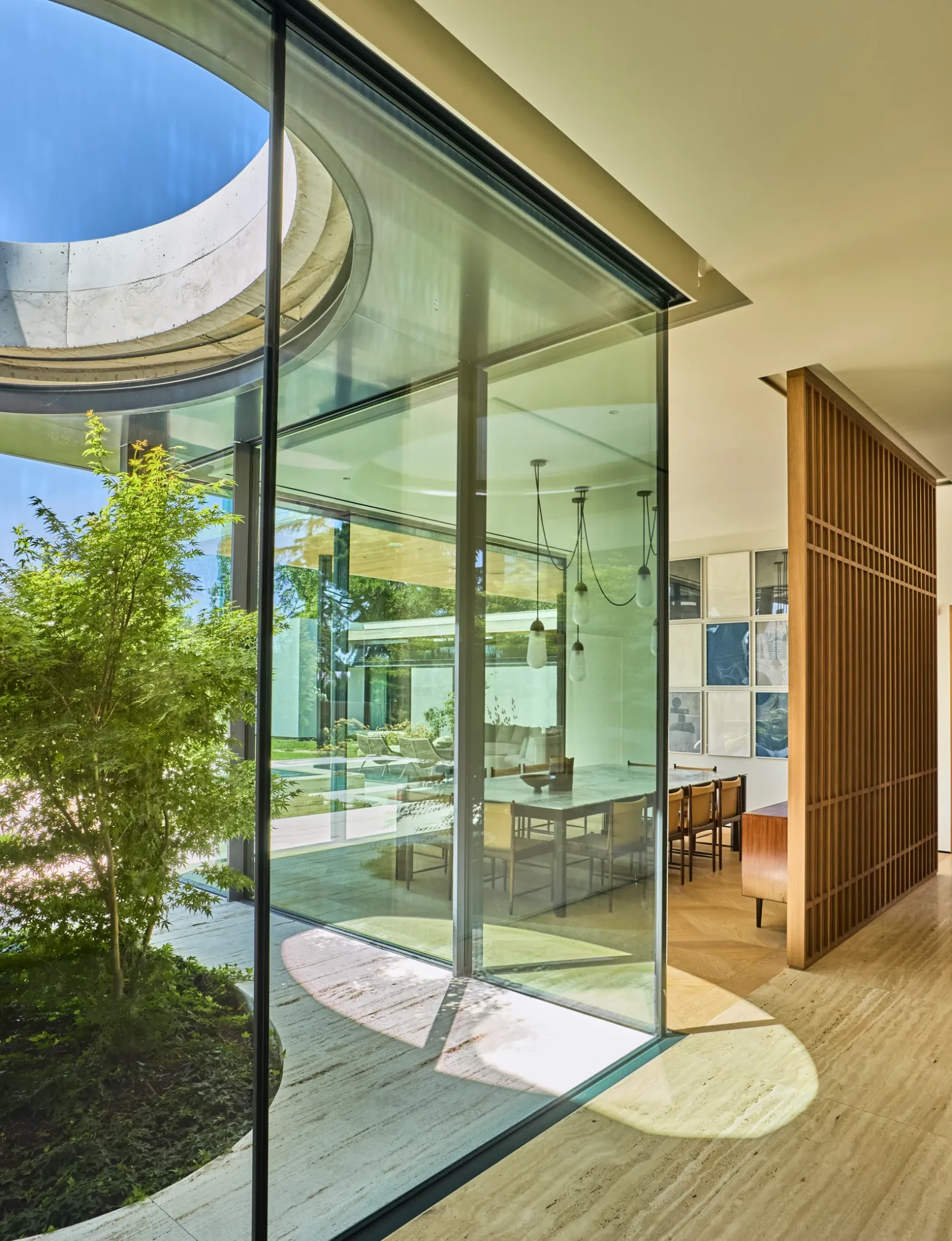 Ολοκληρωμένη το 2024, η κατοικία ανεγέρθηκε σε οικόπεδο που άλλοτε ανήκε σε μεγαλύτερη ισπανική έπαυλη. Το αρχιτεκτονικό γραφείο Bernardi+Peschard δημιούργησε έναν χώρο που συνδυάζει σύγχρονες, καθαρές γραμμές με οργανικά υλικά, όπως ξύλο δρυός και τραβερτίνι, δημιουργώντας έναν συνεχή διάλογο ανάμεσα στο εσωτερικό και το εξωτερικό. Οι μεγάλες γυάλινες επιφάνειες επιτρέπουν στο φυσικό φως να διαχέεται σε κάθε χώρο, ενώ οι προσεκτικά τοποθετημένοι εσωτερικοί και εξωτερικοί χώροι ενισχύουν την αίσθηση συνέχειας και ροής. Τα ανοίγματα προσφέρουν απρόσκοπτη θέα στους κήπους και τα δέντρα, φέρνοντας τη φύση στο εσωτερικό και δημιουργώντας μια διαρκή επαφή με το φυσικό τοπίο.
