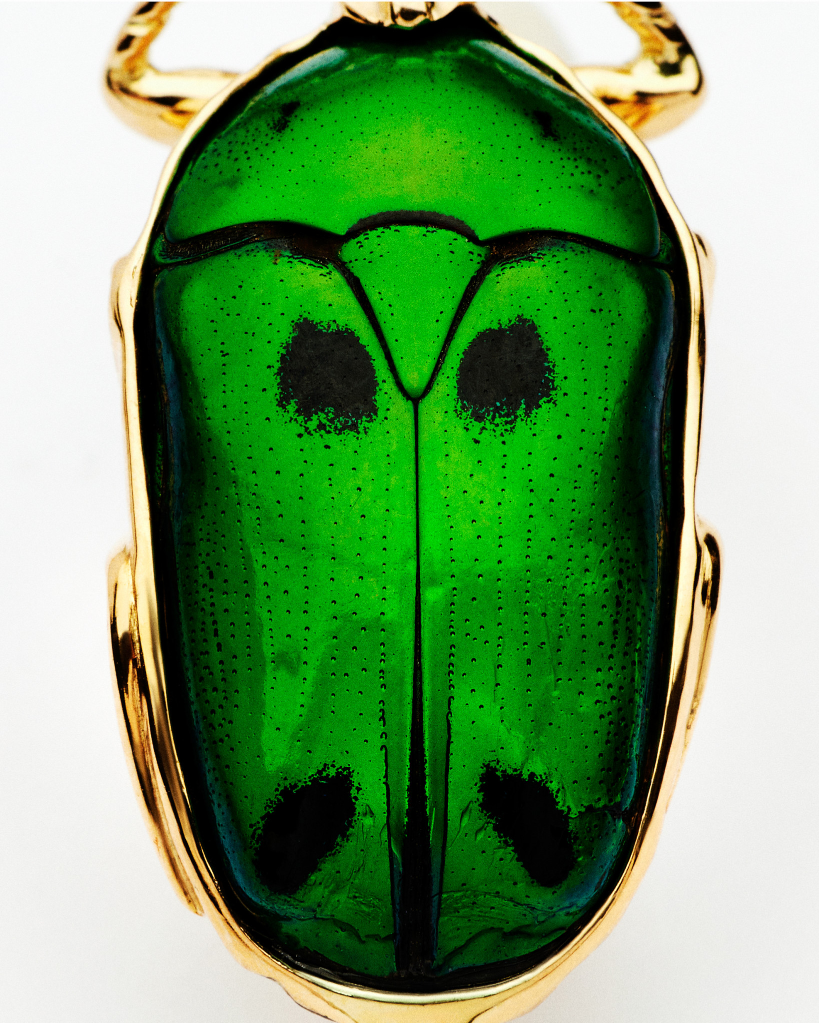 Κάθε κόσμημα στηρίζεται σε μια στιβαρή, χρυσή αρχιτεκτονική δομή που αγκαλιάζει και προστατεύει τον σκαραβαίο. Πριν από την τοποθέτησή του, το έντομο υφίσταται εξειδικευμένες επεξεργασίες ώστε να διατηρηθεί ανέπαφο το εξωτερικό του περίβλημα και να παραμείνουν ζωντανές οι φυσικές του λάμψεις. Οι συνδέσεις, οι αρθρώσεις, τα ελάσματα και οι ενώσεις με τα διαμάντια είναι αποτέλεσμα μικροτεχνίας ακραίας ακρίβειας, λεπτομέρειες που αποκαλύπτονται μόνο κάτω από μεγεθυντικό φακό.