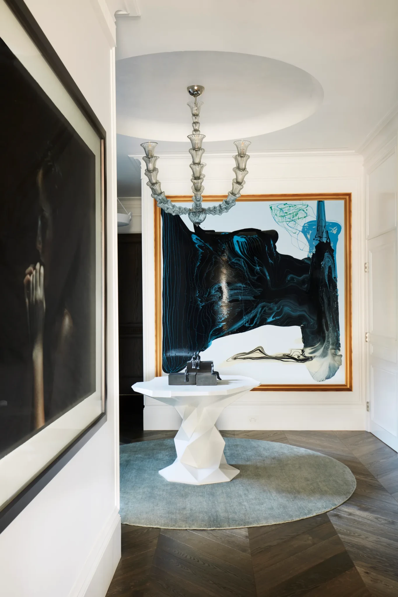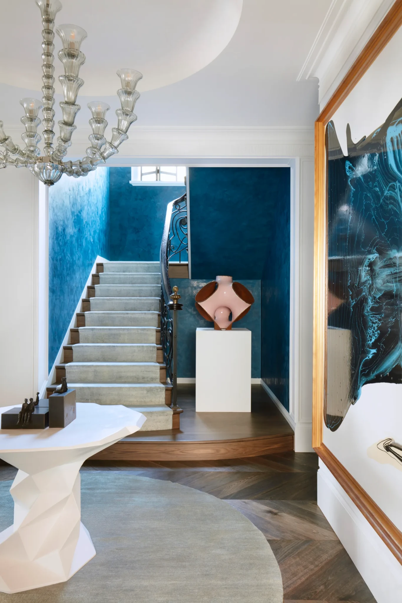 Οι σχεδιαστές επέλεξαν μια εκλεκτική μίξη επίπλων. Σύγχρονα κομμάτια σε συνδυασμό με vintage αντικείμενα από όλο τον κόσμο. Στο διάδρομο, ένα Murano κρυστάλλινο πολυέλαιο κοντράρεται με ένα μεγάλο μπλε-λευκό έργο του Dale Frank και μια ροζ μεταλλική σύνθεση του James Angus.