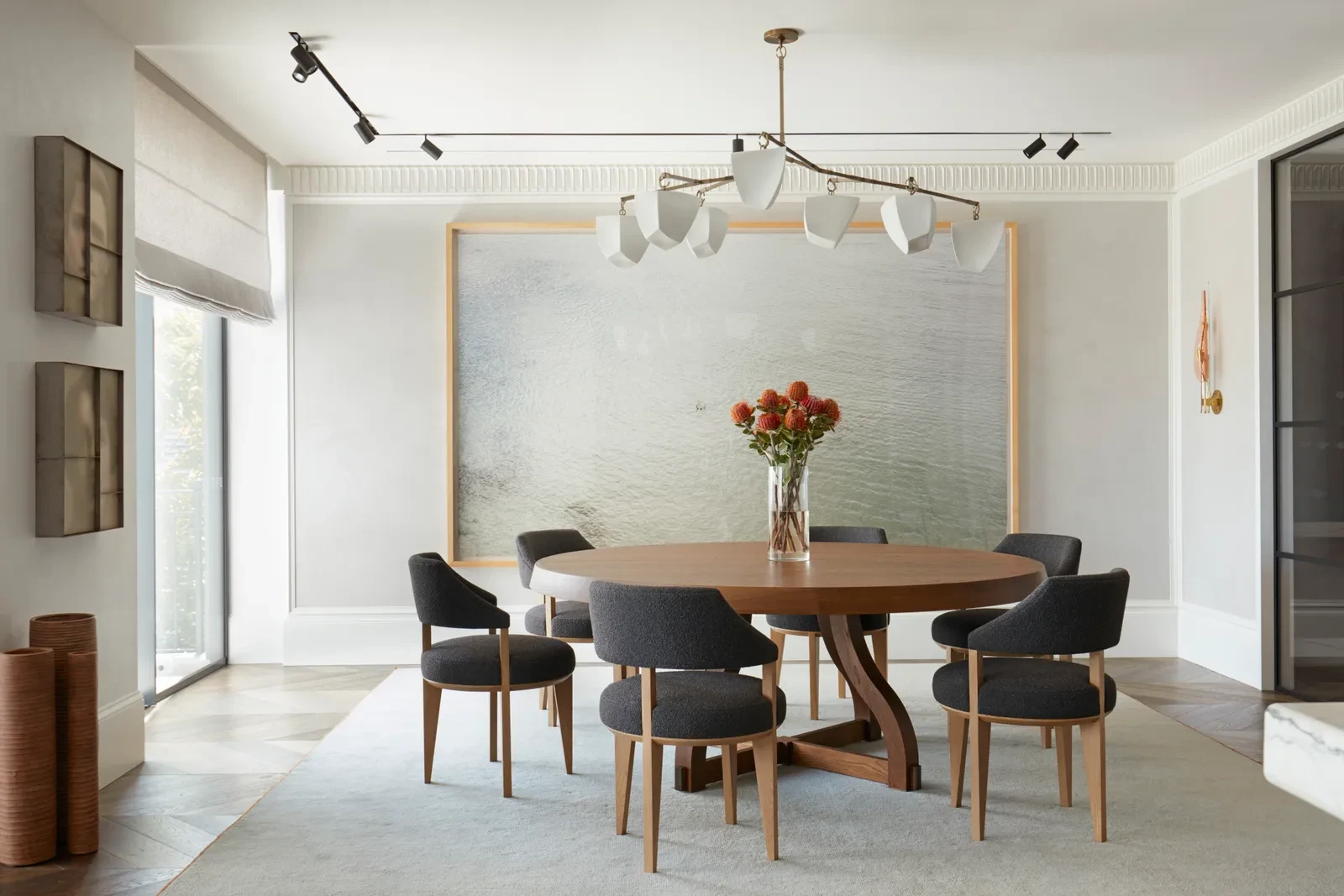 Στην τραπεζαρία, οι τοίχοι με microcement και οι διακριτικές καλούπες συνδυάζονται με μια γαλήνια φωτογραφία νερού από τον Richard Misrach, που ενισχύει το θέμα της γειτνίασης με τη θάλασσα. Δίπλα στο τραπέζι υπάρχει ένα custom made κελάρι κρασιών από μάρμαρο και ξύλο Japanese burlwood, που προσθέτει μια νότα υψηλής κομψότητας στον χώρο.