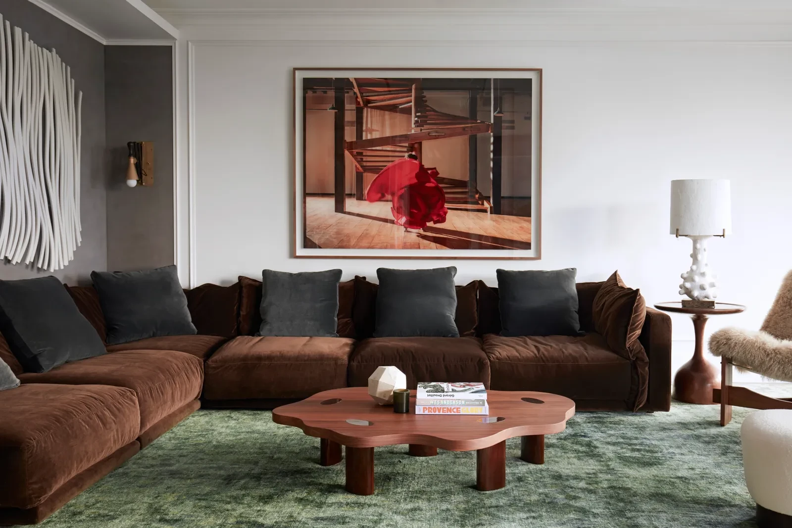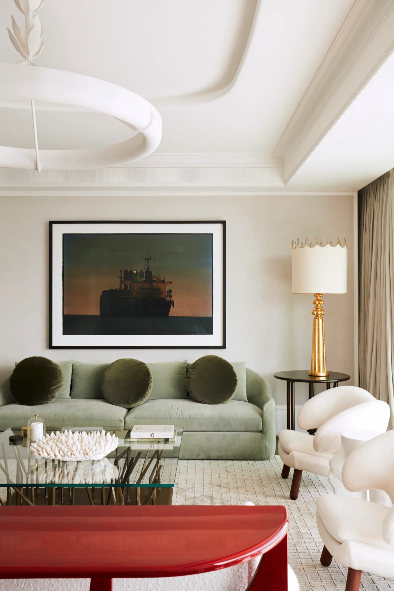 Στο σαλόνι, ένας πράσινος καναπές από Dmitriy & Co συνοδεύεται από κρεμ καρέκλες Finn Juhl και μια κόκκινη κονσόλα από τον Hannes Peer. Στο πάνω επίπεδο, ένα φωτογραφικό έργο με έντονα κόκκινα άνθη από την Tamara Dean «επικοινωνεί» με μια μεταλλική κονσόλα από τον John Pomp.