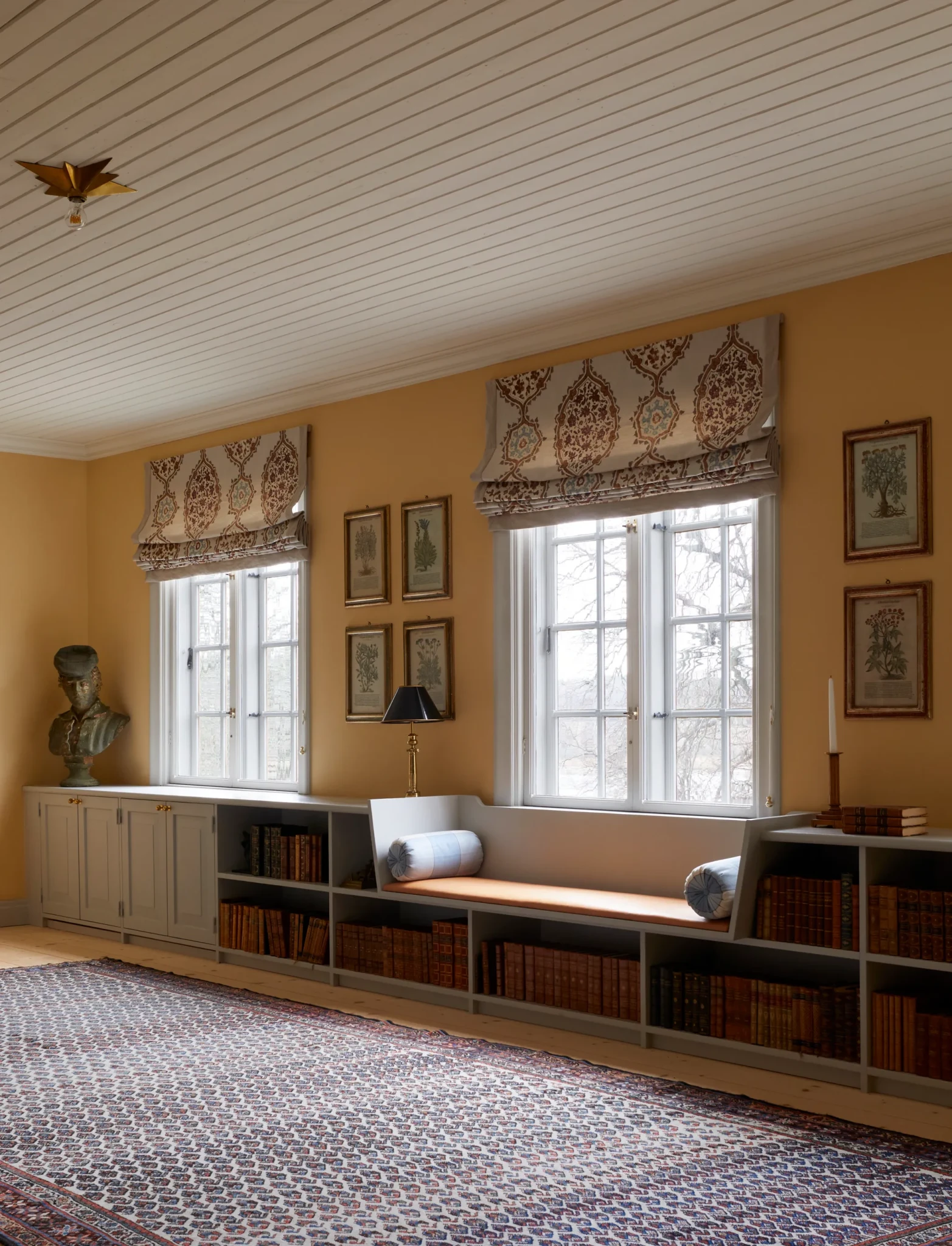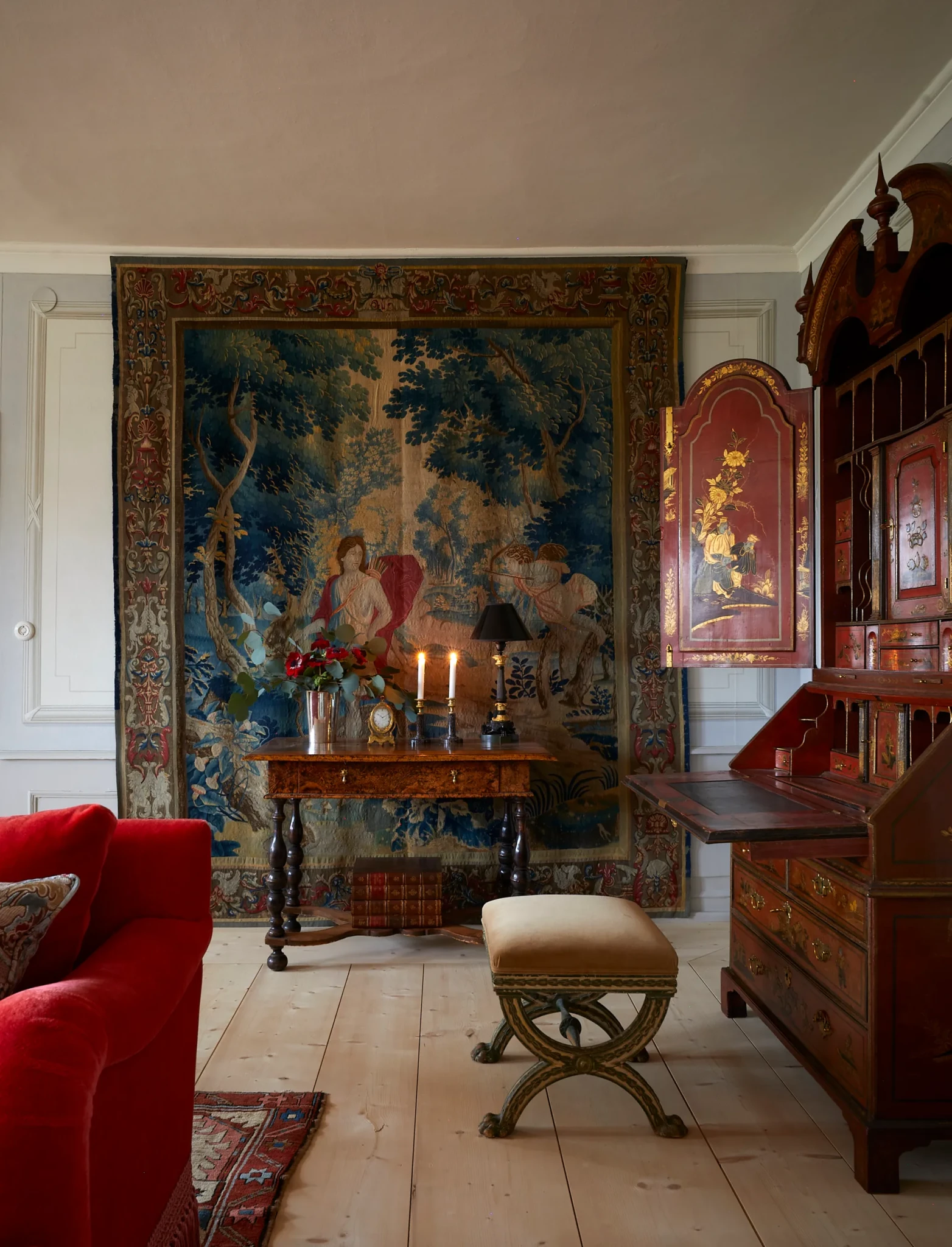 Αναφορικά με την επίπλωση του σπιτιού, η ομάδα της Studio Ramson απευθύνθηκε στον Pontus Silfverstolpe, ο οποίος φέρει το παρατσούκλι «ο ντετέκτιβ με τις αντίκες», με σκοπό να βρουν κεντρικά statement έπιπλα που θα έδιναν περισσότερο χαρακτήρα στους χώρους. Σε αυτόν οφείλεται το εμβληματικό έπιπλο του σαλονιού, το λακαρισμένο ντουλάπι, το οποίο δένει αρμονικά με τους κόκκινους καναπέδες και την πράσινη φλαμανδική ταπισερί.