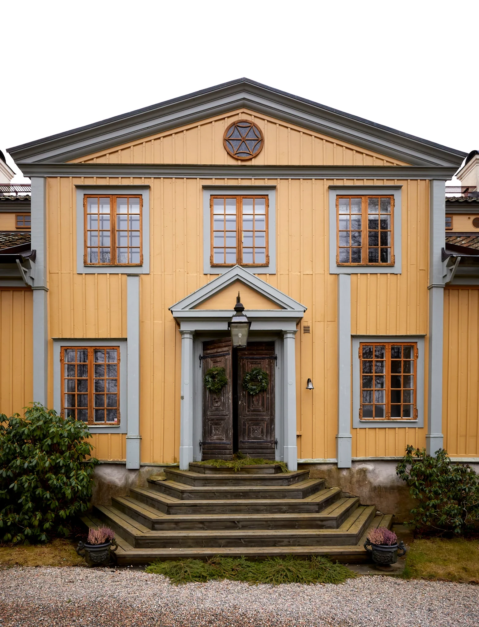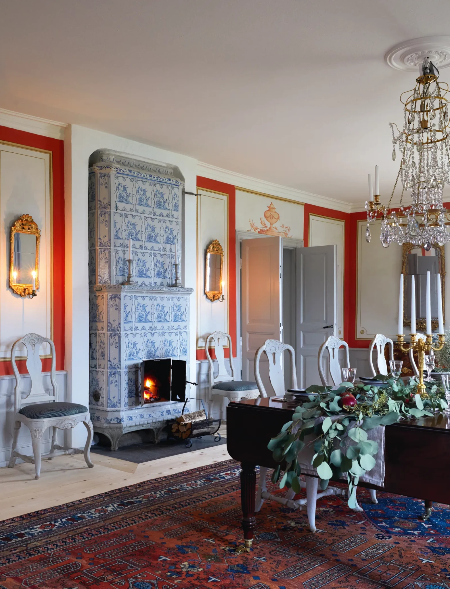 Στην κουζίνα τα πλακάκια του τοίχου είναι χειροποίητα Delft από την εταιρεία “Douglas Watson Studio”, στα οποία αποτυπώνονται τοπικές σκηνές από το γύρο περιβάλλον όπως ζώα και φυτά, ενώ οι ζωγράφοι από το στούντιο Abovo Antik & Ateljé ανέλαβαν να προσθέσουν μοτίβα και σκηνές πάνω από τις εσωτερικές πόρτες του σπιτιού.