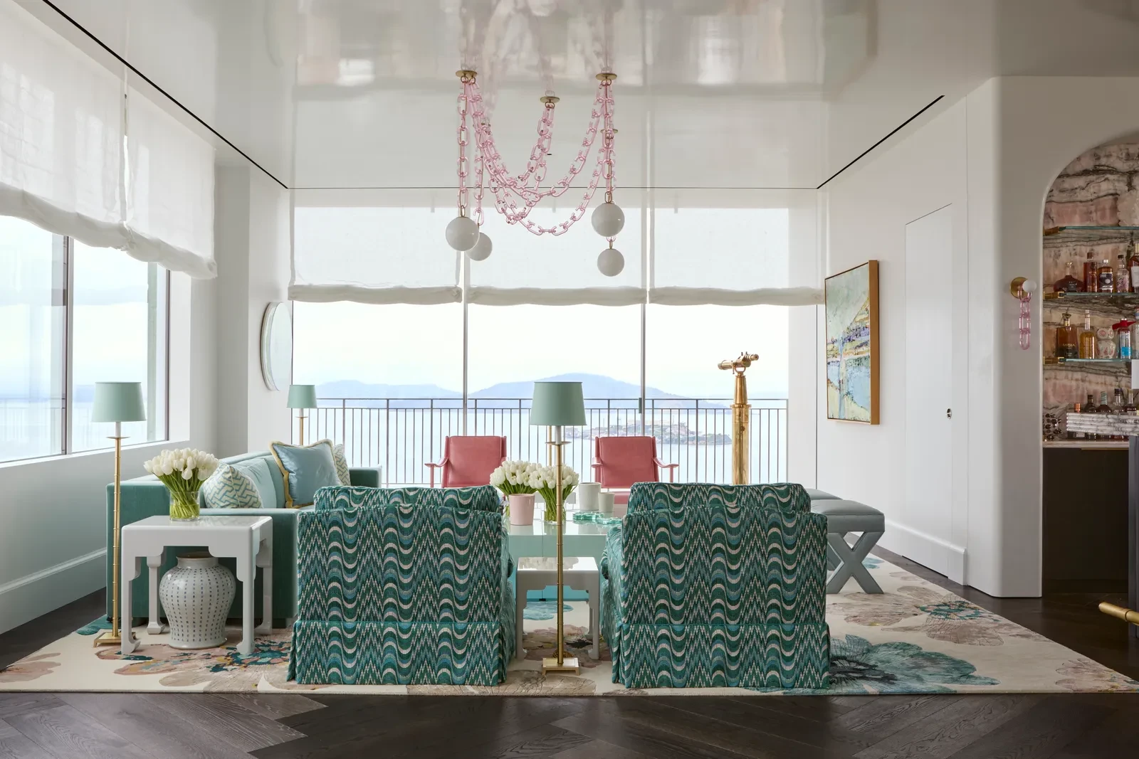 Το σαλόνι υποδέχεται τους καλεσμένους του με ένα εντυπωσιακό μπαρ από ροζ ονυχίτη με κρυφό φωτισμό και μια disco ball. Μπροστά του στέκονται ροζ βελούδινα σκαμπό και δύο πολυθρόνες από το Hotel Costes στο Παρίσι, με βελούδινες τιγρέ ταπετσαρίες δημιουργώντας μια υπέροχη αντίθεση. Η χρωματική παλέτα του υπόλοιπου καθιστικού είναι εμπνευσμένη από τη θάλασσα του San Francisco, ενώ τον χώρο συμπληρώνουν ιδιαίτερα αντικείμενα όπως ένας βελούδινος καναπές, πολυθρόνες από τη συλλογή «The Warborough Collection» κι ένα χαλί Anemone σε ειδικό χρώμα από τη "The Rug Company". Σε ένα επιπλέον και πιο casual καθιστικό ο καναπές είναι Sedilla.