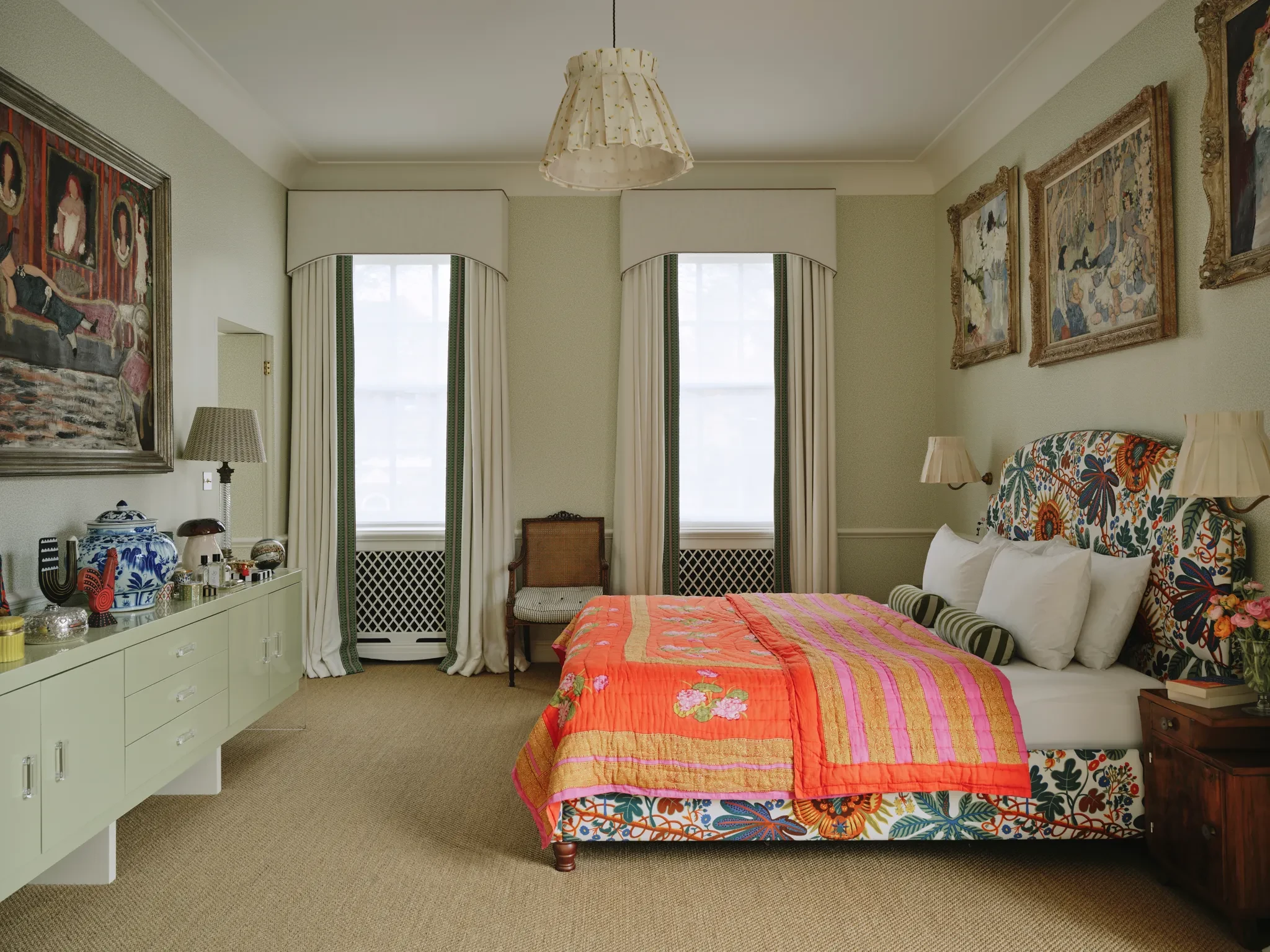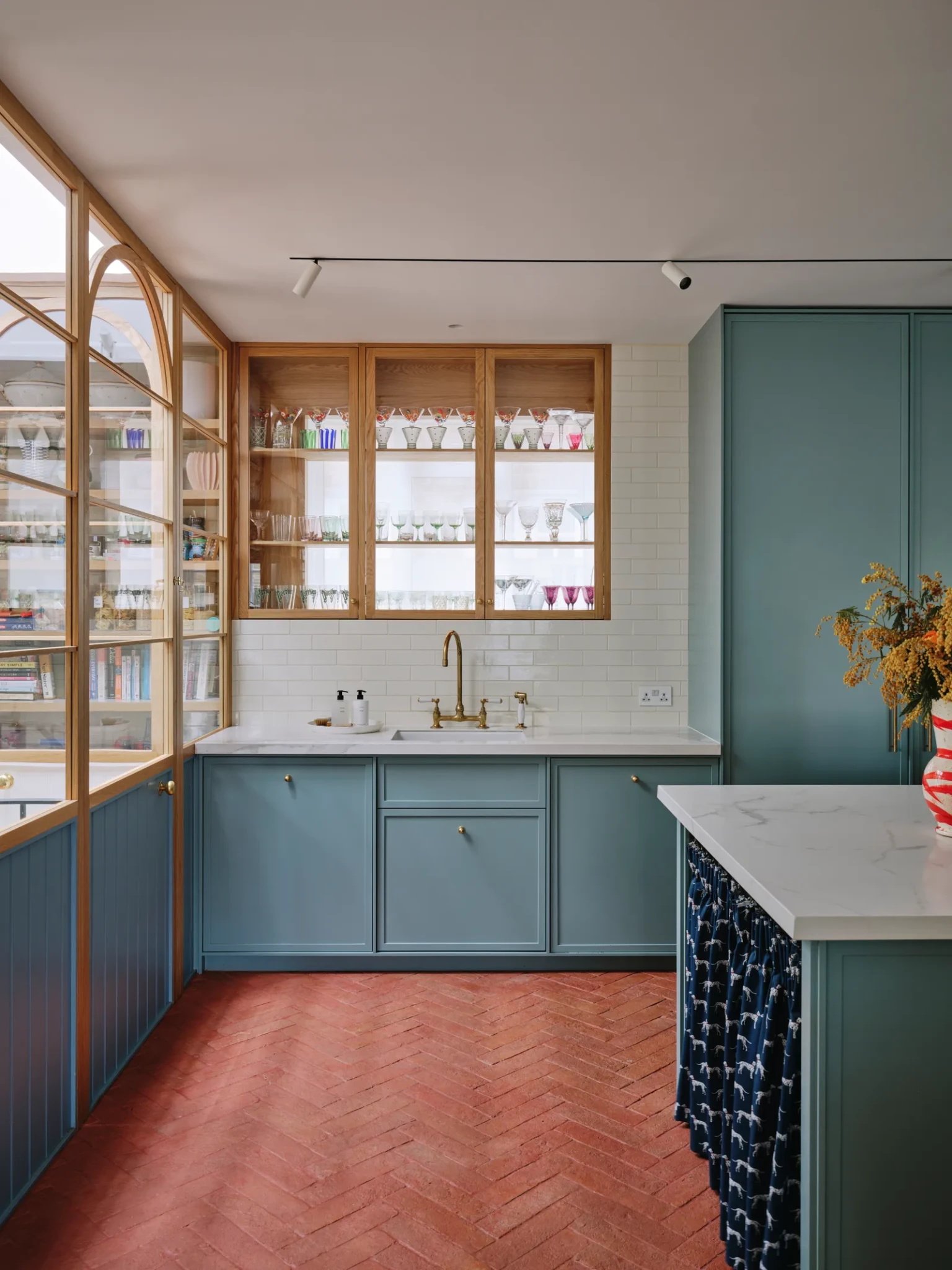 Οι ντουλάπες της κουζίνας βάφτηκαν σε απαλή μπλε απόχρωση "Oval Room Blue" από την Farrow & Ball, ενώ φωτεινά φωτιστικά που κρέμονται πάνω από τον πάγκο κάνουν τον χώρο πιο φιλικό και προσωπικό. Η επιλογή χρωμάτων και υφών ήταν αποτέλεσμα στενής συνεργασίας μεταξύ του αρχιτέκτονα και μιας συμβούλου χρωμάτων, ώστε το σπίτι να κρατήσει την παράδοση αλλά να αποκτήσει μια πιο σύγχρονη αίσθηση.