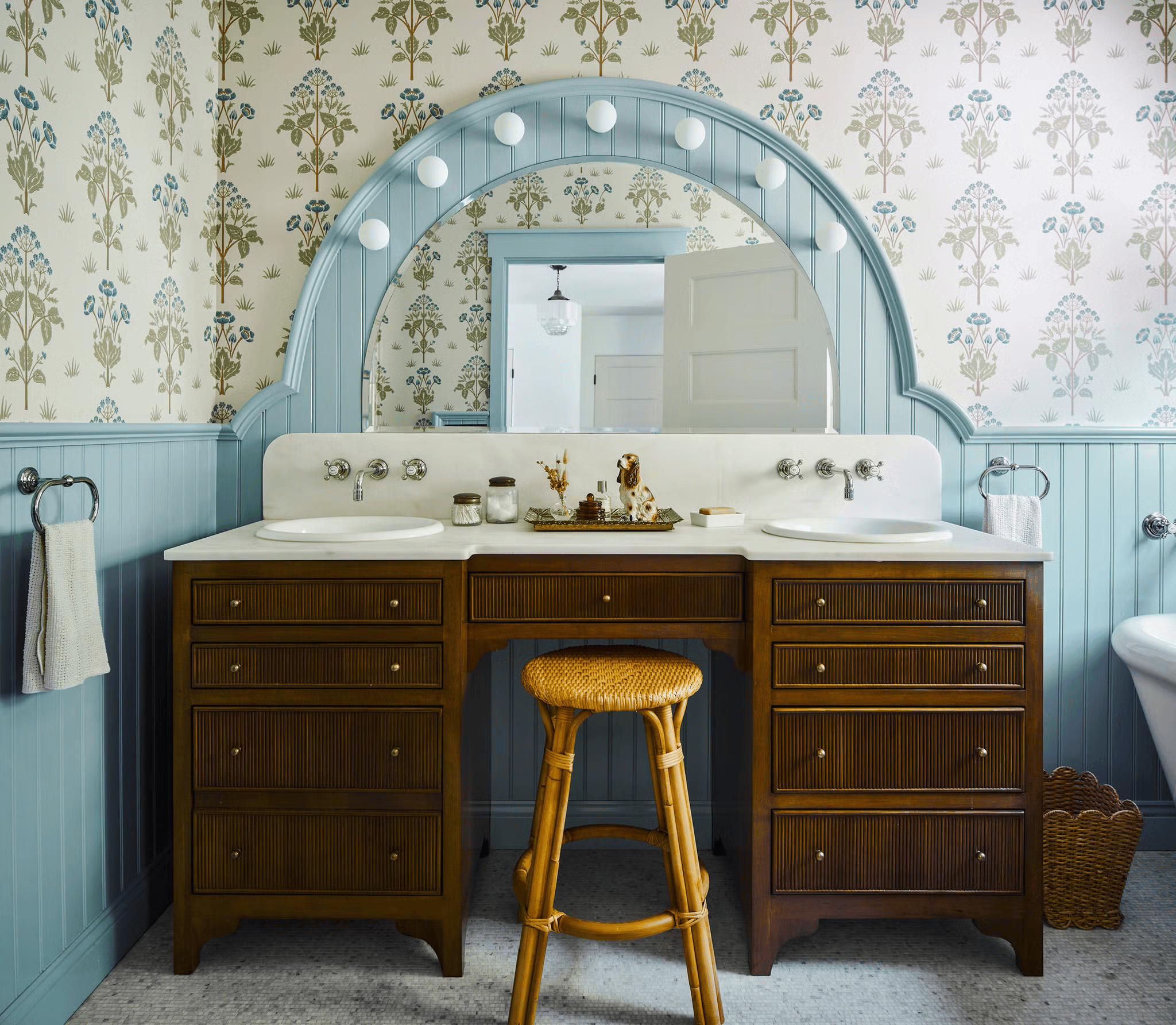 Εμπνευσμένο από την αίγλη του παλιού Hollywood, το κεντρικό μπάνιο είναι ντυμένο με μια φλοράλ ταπετσαρία που δένει απόλυτα με την υπόλοιπη αισθητική του σπιτιού, ενώ τα πλακάκια υπάρχουν παντού κάτι που στην τελική φάνηκε να είναι μια πολύ σωστή απόφαση.