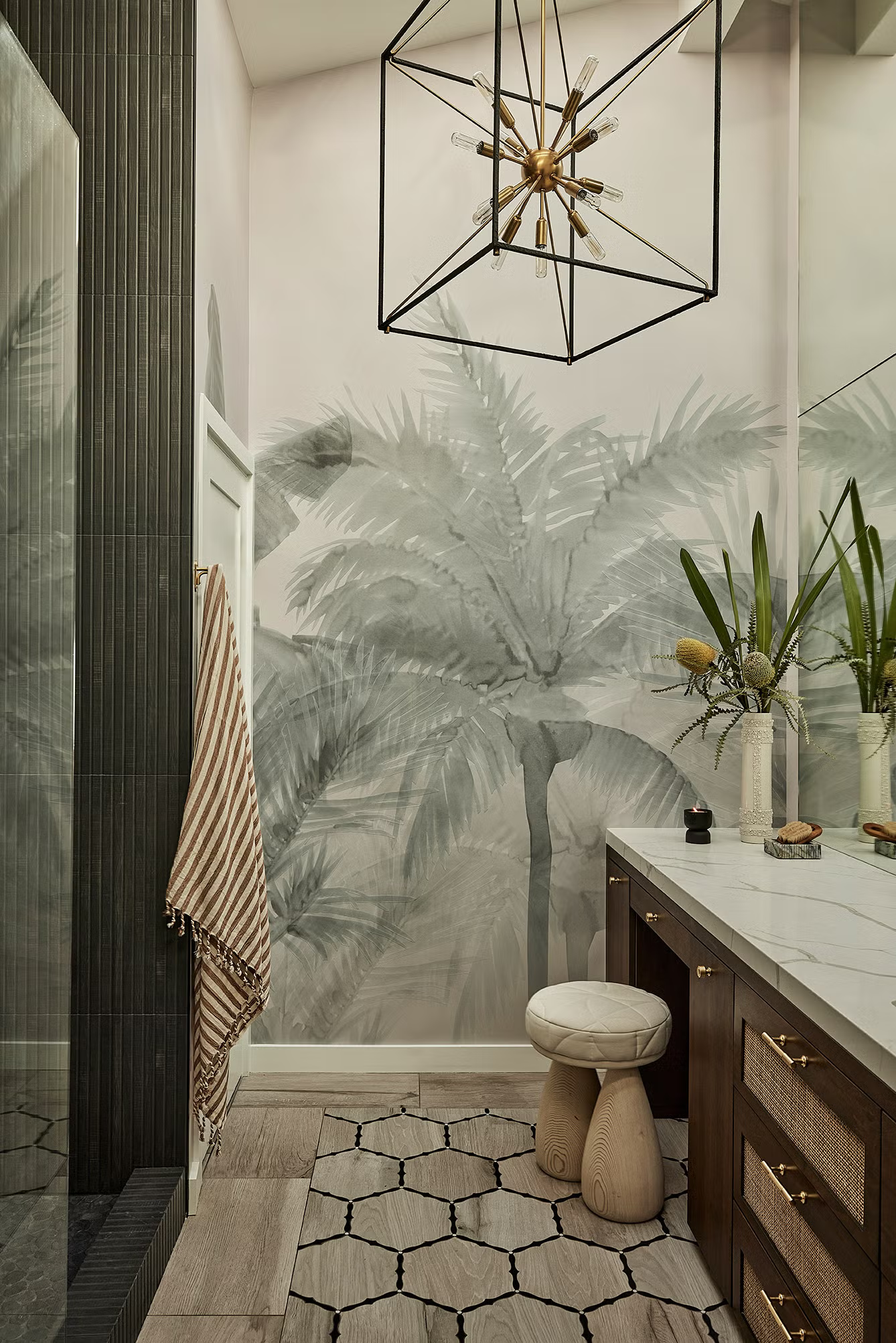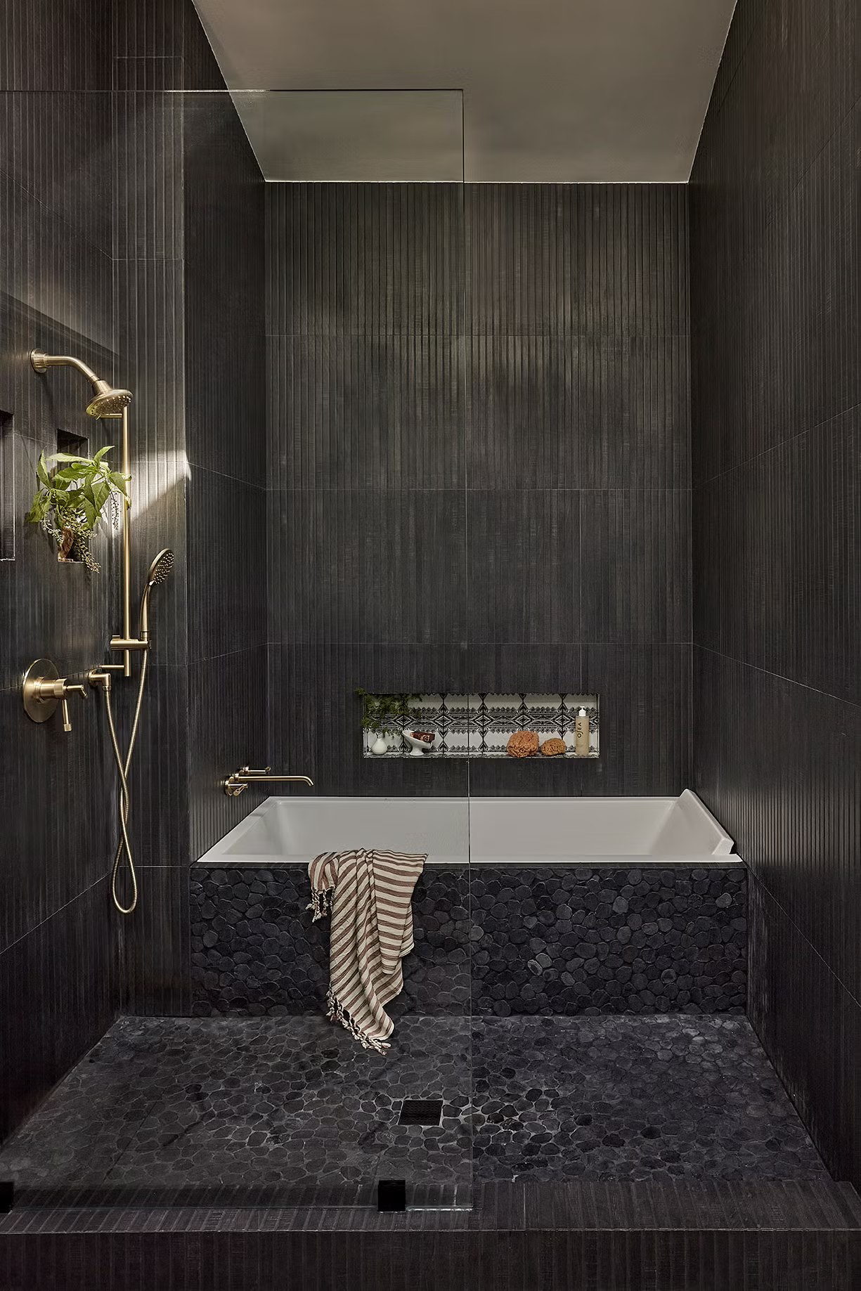 Το κεντρικό μπάνιο δεν άλλαξε πολύ από την αρχική του μορφή. Εκτός από την απομάκρυνση ενός παραθύρου και την αντισκατάστασή του με μία τοιχογραφία, η διαρρύθμιση παρέμεινε ακριβώς η ίδια. Η Persad απλώς ανακαίνισε ολόκληρο το ντους με δύο ειδών μαύρα πλακάκια από την Tilebar και μια σειρά από πλακάκια με σχέδια στην εσοχή της μπανιέρας από την Country Floors.