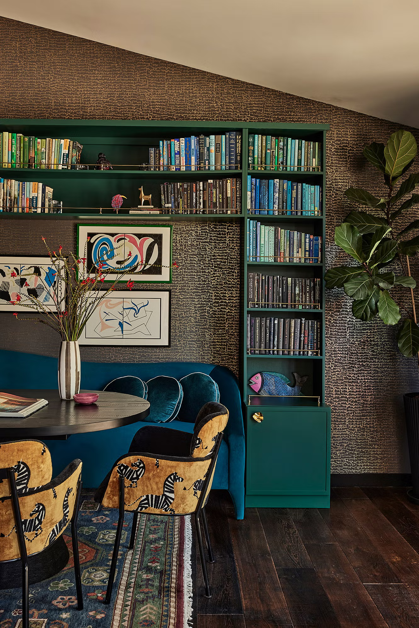 Στο κέντρο της κατοικίας βρίσκεται μια πολυλειτουργική τραπεζαρία- βιβλιοθήκη που συνδυάζει τον επίσημο χώρο του φαγητού με το χώρο ανάγνωσης και βιβλιοφιλικών συγκεντρώσεων. Η Persad σχεδίασε έναν χώρο που μπορεί να χρησιμοποιηθεί όχι μόνο για γεύματα, αλλά και για βραδιές book club και δημιουργικής αλληλεπίδρασης με φίλους, σύμφωνα με τα «θέλω» της ιδιοκτήτριας.