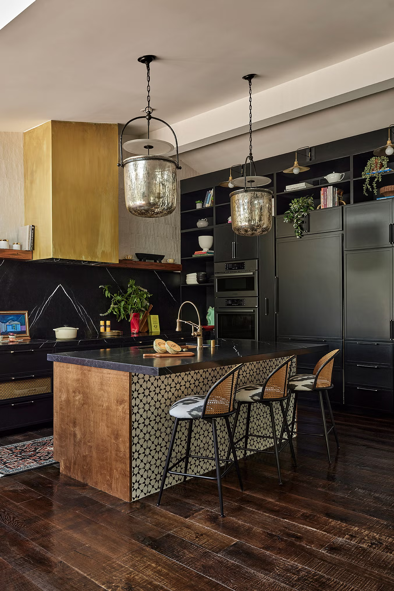 Η Persad απομακρύνθηκε από τις συνηθισμένες λευκές κουζίνες και στράφηκε σε βαθύτερες αποχρώσεις δίνοντας μία πιο δραματική και σκοτεινή εμφάνιση στο χώρο με custom made ντουλάπια και πλούσιες υφές.