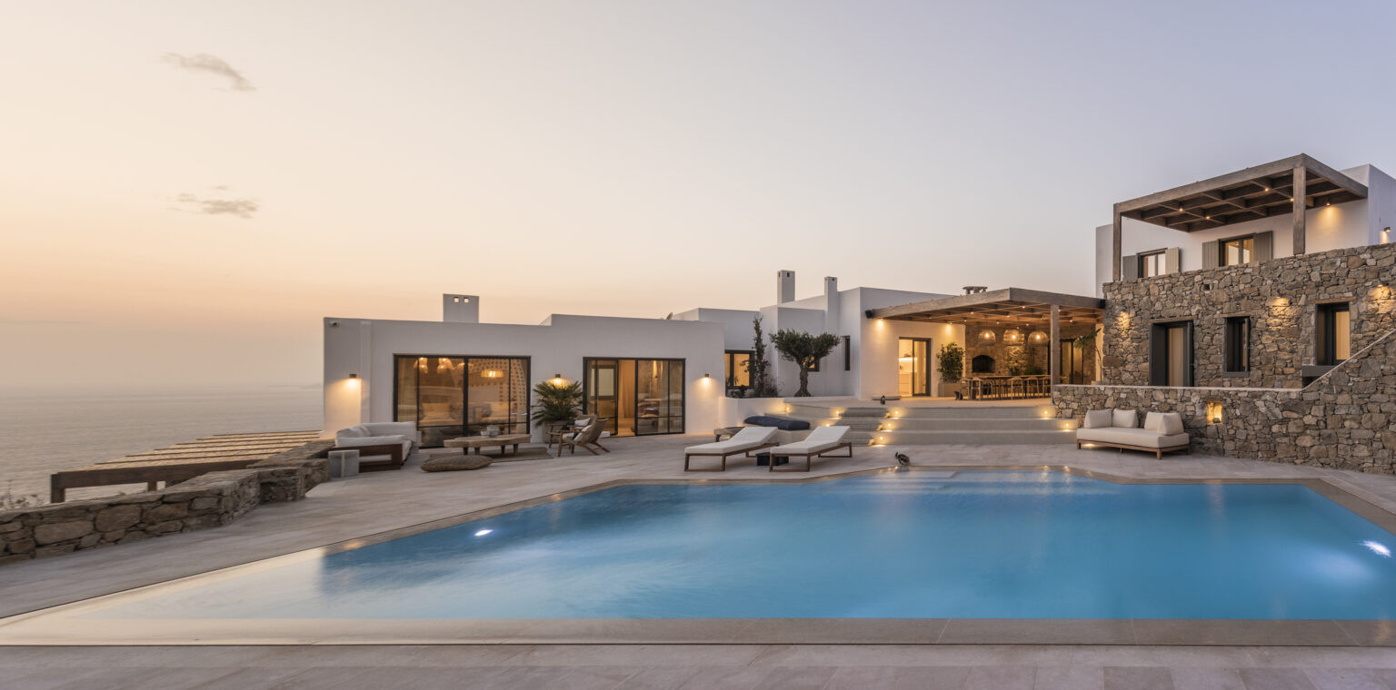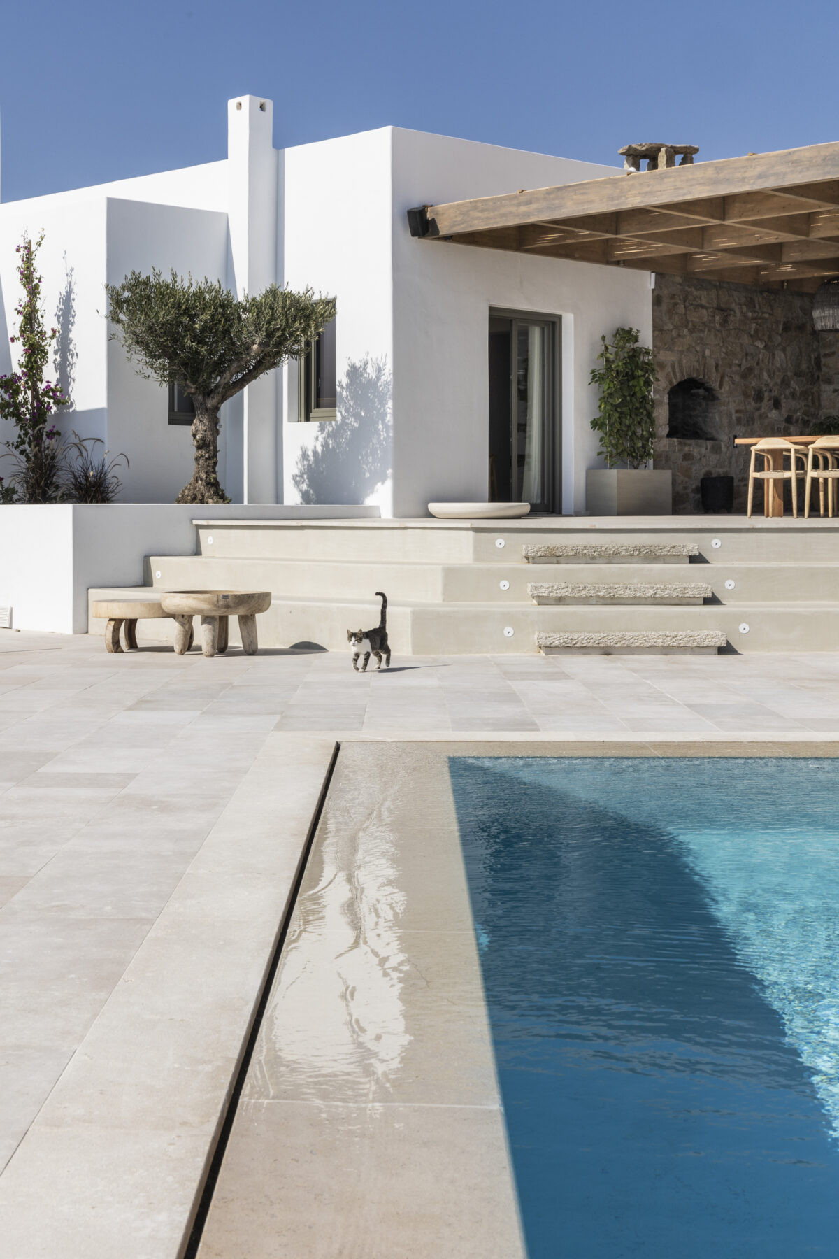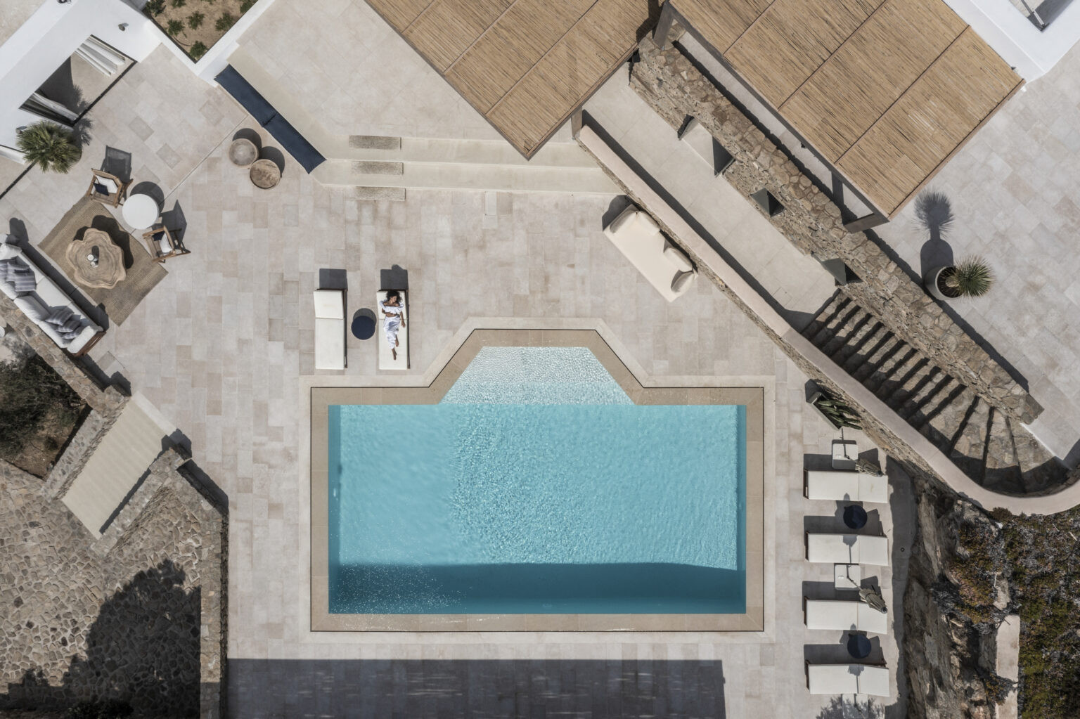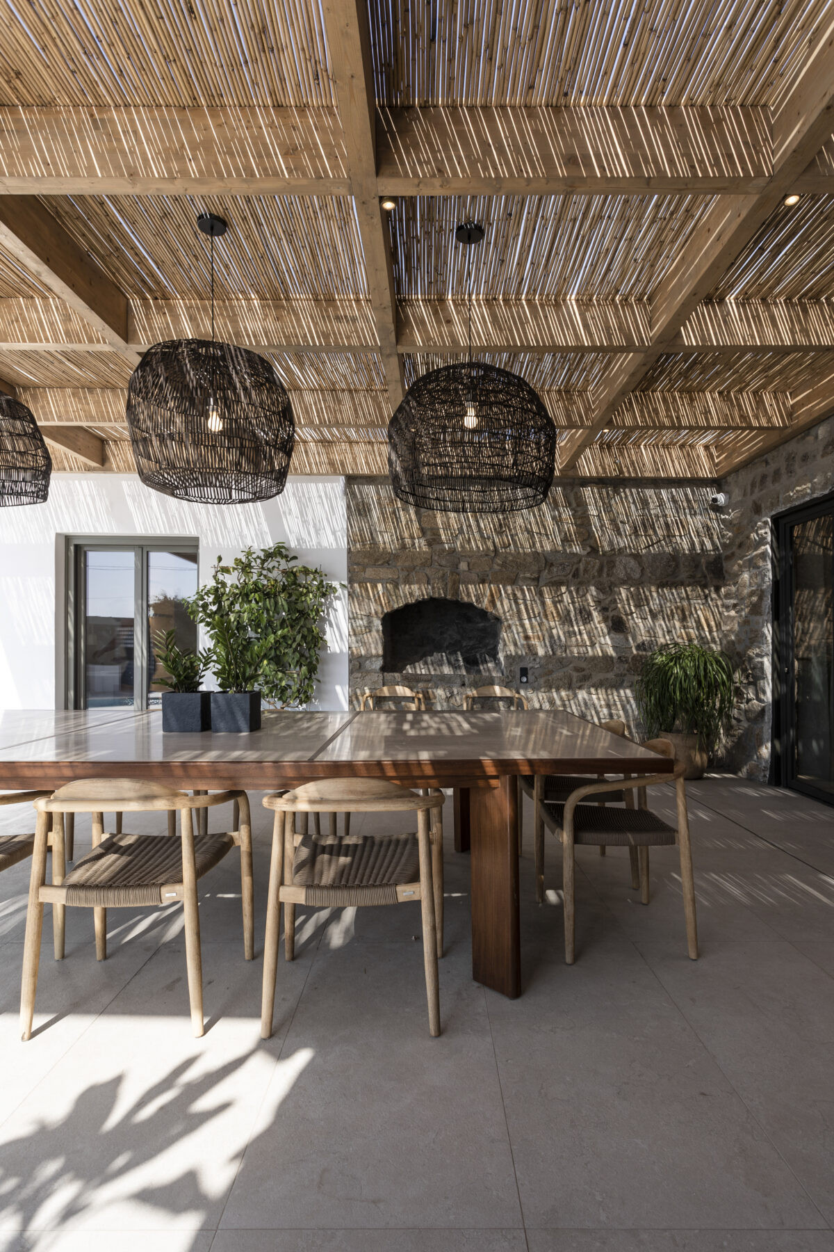 Υλικά όπως η πέτρα και το ξύλο έχουν πρωταγωνιστικό ρόλο στη δομή της βίλας, εξασφαλίζοντας μια συνεκτική, αρμονική και φυσική ένταξη στο τοπίο, δημιουργώντας σε κάθε γωνιά την αίσθηση ότι το κτίσμα είναι μέρος του περιβάλλοντος και όχι κάτι ξένο. Αυτό το εύστοχο μείγμα παράδοσης και μοντερνισμού έχει επιτευχθεί με απόλυτη επιτυχία, προσφέροντας μια μοναδική εμπειρία διαμονής στη Μύκονο.