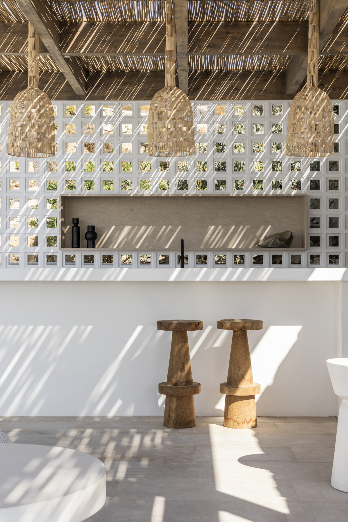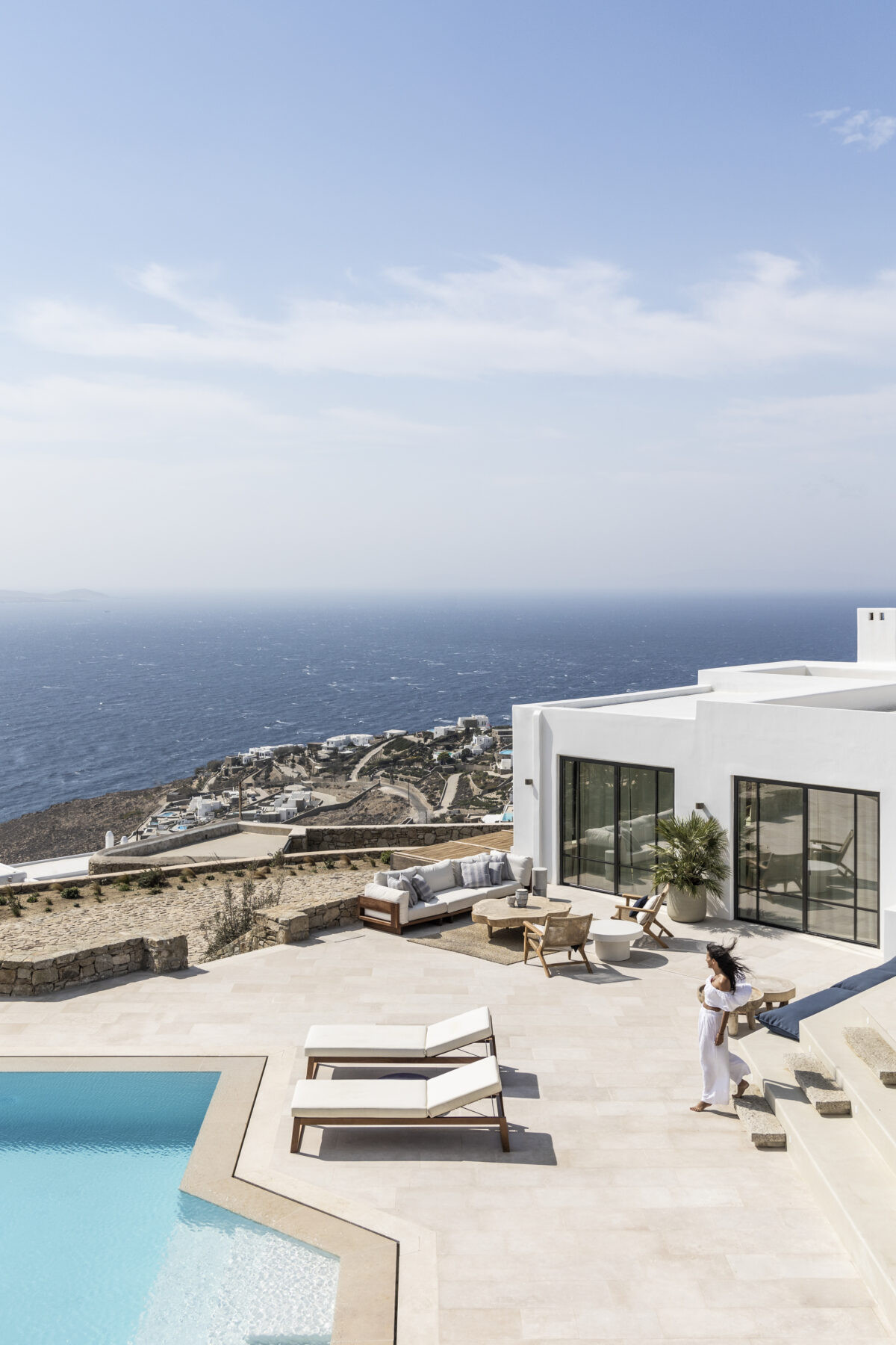 Μικρά, προσεκτικά διαμορφωμένα σαλόνια είναι διάσπαρτα σε διάφορα σημεία της βίλας, προσφέροντας ιδανικούς χώρους για ιδιωτικές συναντήσεις και στιγμές ηρεμίας. Όλα τα παραπάνω έχουν σχεδιαστεί με γνώμονα την ανάδειξη της φυσικής ομορφιάς και της απλότητας της μυκονιάτικης αρχιτεκτονικής και του περιβάλλοντος τοπίου.