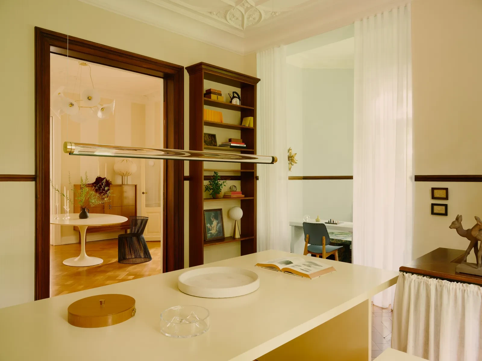 Η Ladner δεν αφαίρεσε τα ιστορικά χαρακτηριστικά του κτιρίου, αντίθετα τα ανέδειξε: τα ταβάνια διατηρήθηκαν ανέπαφα χωρίς μα χάσουν την αίσθηση της μεγαλοπρέπειας, το ξύλινο πάτωμα έγινε ο καμβάς που ενώνει οπτικά όλους τους χώρους, ενώ τα στερεά ξύλινα κουφώματα αναδεικνύουν την αρχική αρχιτεκτονική.