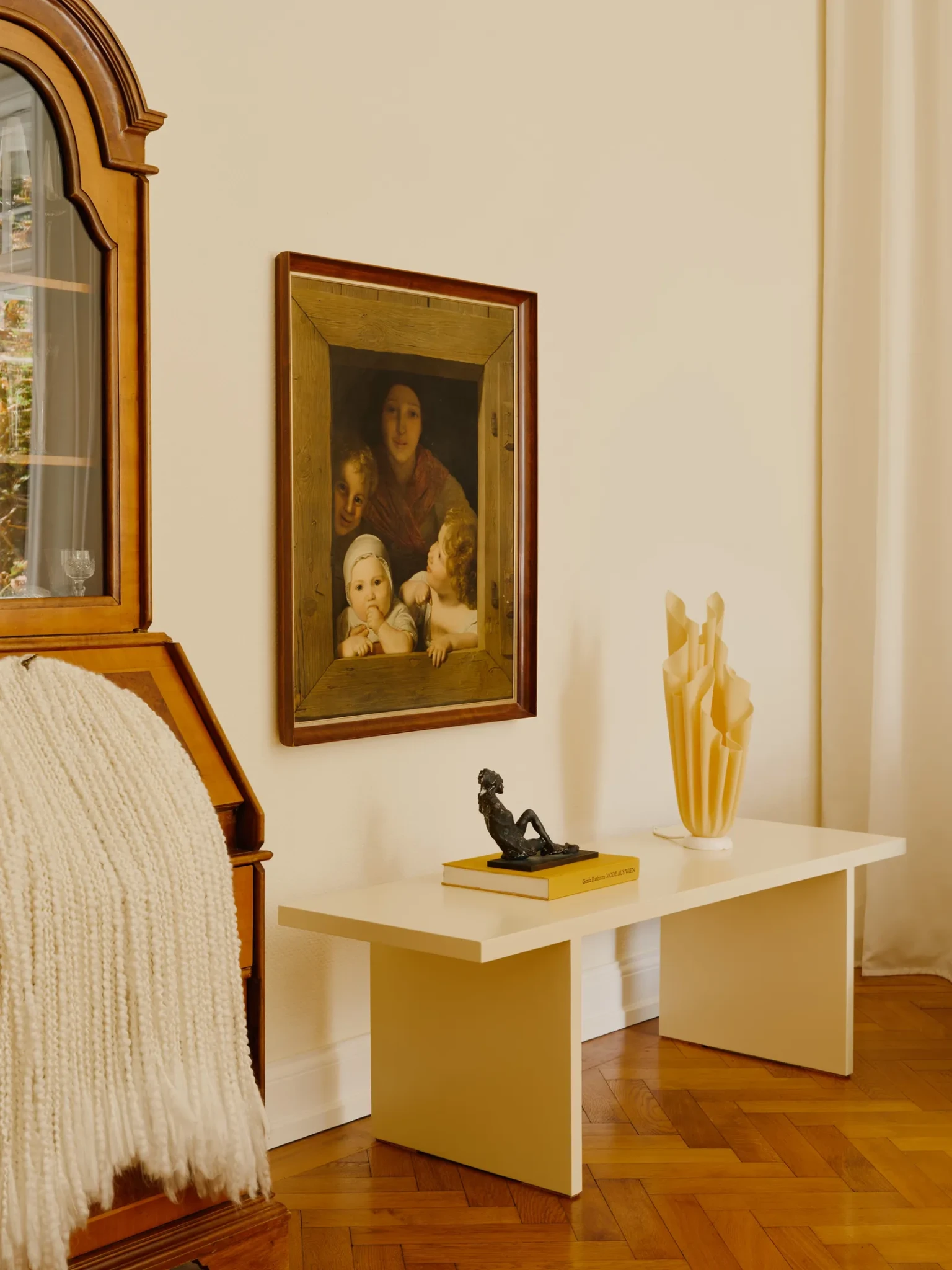 Στους υπόλοιπους χώρους, τα υφάσματα και οι μακριές κουρτίνες δημιουργούν αίσθηση άνεσης και «ασφάλειας», επιτρέποντας στο φυσικό φως να παίζει με τους τόνους του κίτρινου και να ενισχύει την αίσθηση ζεστασιάς.