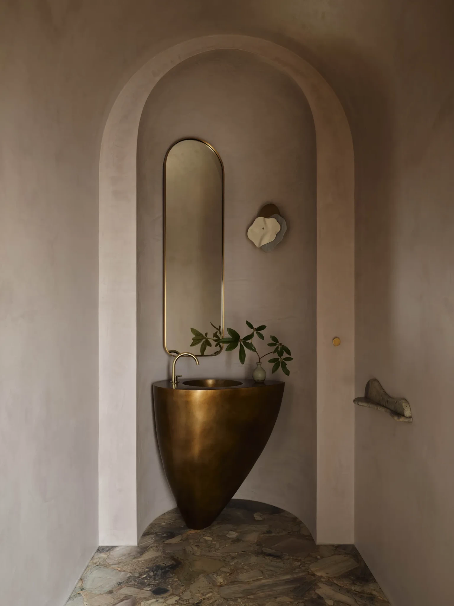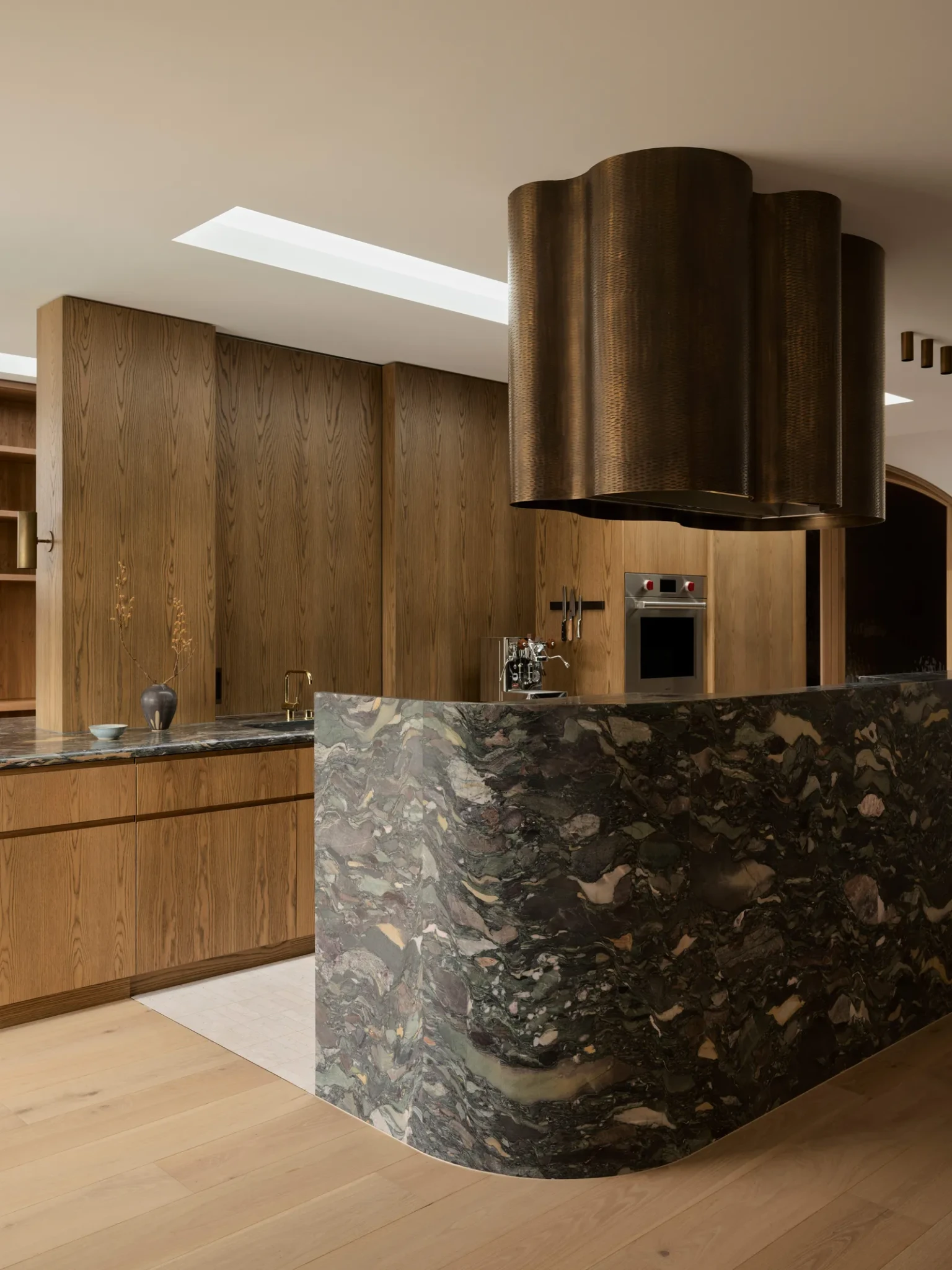 Η λεπτομέρεια κάνει τη διαφορά σε κάθε γωνιά του σπιτιού. Τα έπιπλα που έχουν κατασκευαστεί ειδικά για τον χώρο μαρτυρούν τη συνεργασία με τεχνίτες που γνωρίζουν το υλικό τους καλύτερα από τον καθέναν. Τα καθίσματα στις γωνιές του breakfast space, τα χειροποίητα κρεβάτια, οι καλαίσθητοι πάγκοι και οι σταθερές επιφάνειες αποτελούν ελάχιστα παραδείγματα ενός συνόλου που έχει σχεδιαστεί εξαρχής για να ταιριάζει απόλυτα στη γεωμετρία του σπιτιού. Ο μπρούτζινος νιπτήρας, το επιβλητικό τραπέζι των 22 θέσεων και ο απορροφητήρας της κουζίνας -ένα ολόκληρο γλυπτό βάρους τριακοσίων κιλών- είναι σημεία εστίασης, μικρά έργα τέχνης που απογειώνουν την προσωπικότητα του σπιτιού.