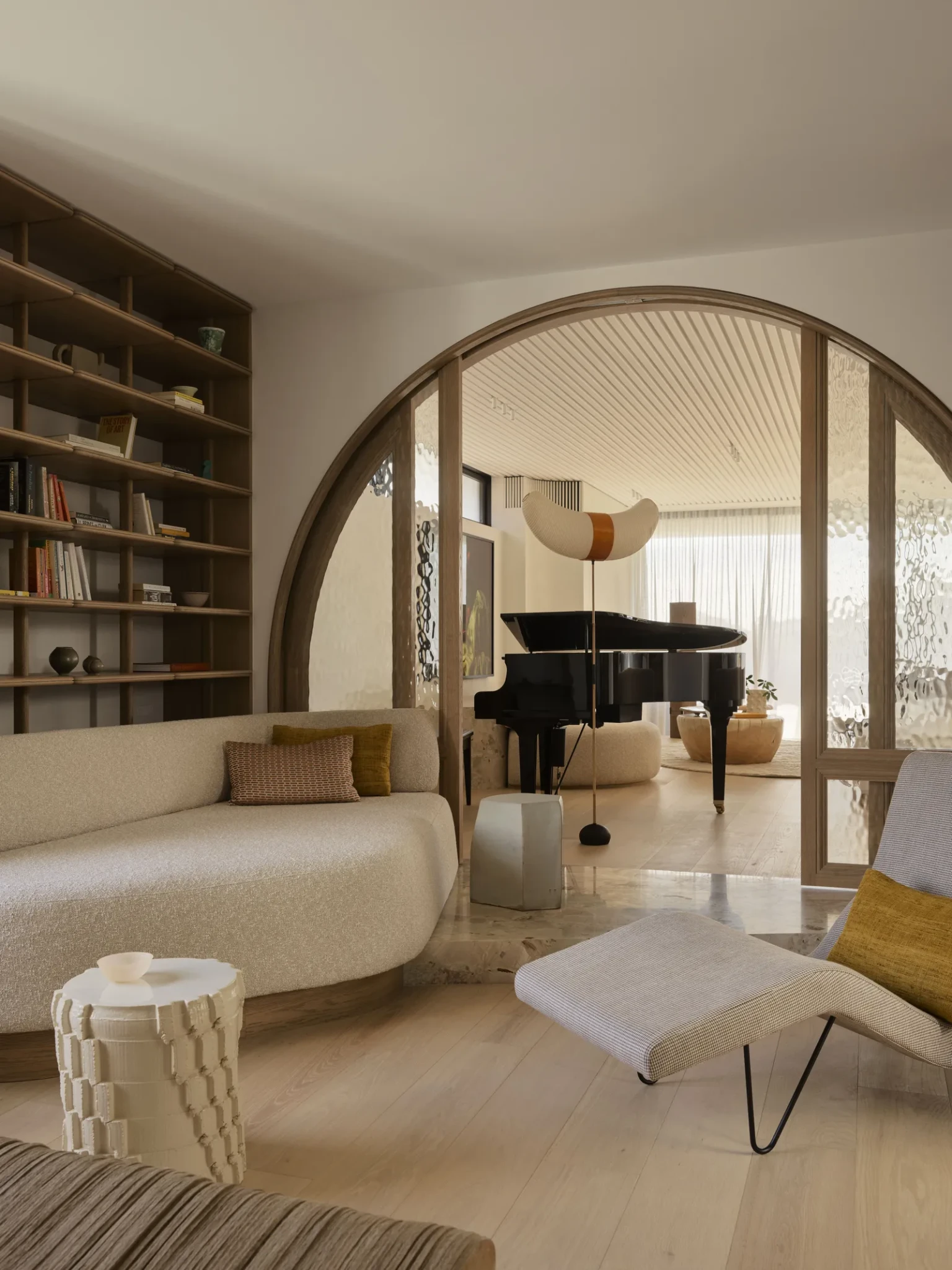 Η εντυπωσιακή είσοδος διπλού ύψους λειτουργεί σαν μια σύγχρονη πύλη στο μέλλον. Το φως που κατεβαίνει από τον στρογγυλό θόλο φιλτράρεται σαν χρυσή ομίχλη μέσα από τον χώρο και απλώνεται στα πατώματα, τονίζοντας κάθε καμπύλη και κάθε κάθετη γραμμή. Η παλιά αίθουσα αποτελεί πλέον ιστορική υποσημείωση, αντικατασταθείσα από μια πιο ανάλαφρη αρχιτεκτονική γλώσσα που μοιάζει σαν να αγκαλιάζει το όλο σύνολο της κατοικίας.