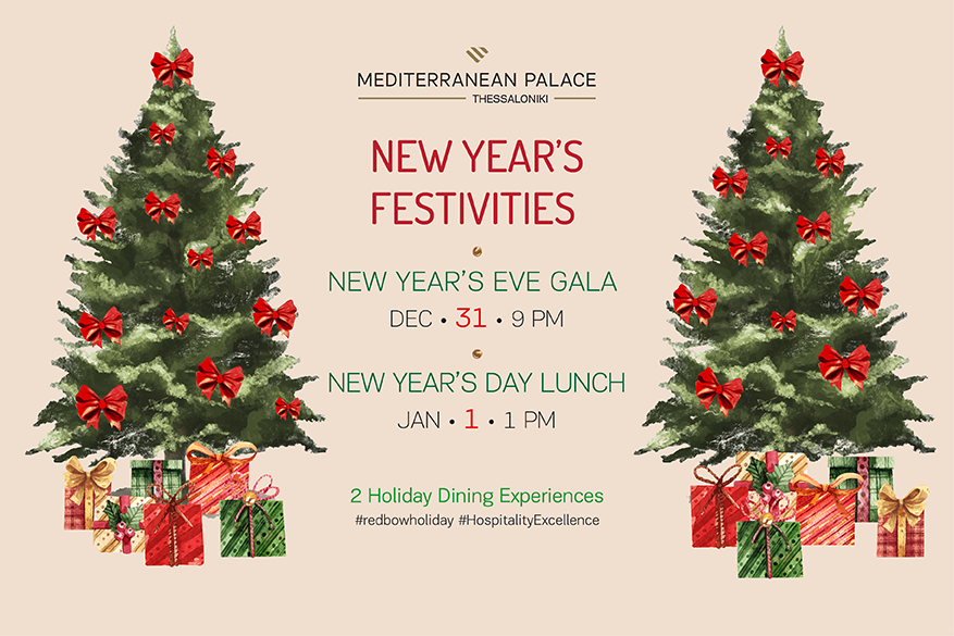 Το Mediterranean Palace Hotel μας υποδέχεται σε μία μαγική ατμόσφαιρα με σκοπό να υποδεχτούμε το νέο έτος όπως του αρμόζει, σε ένα λαμπερό περιβάλλον.