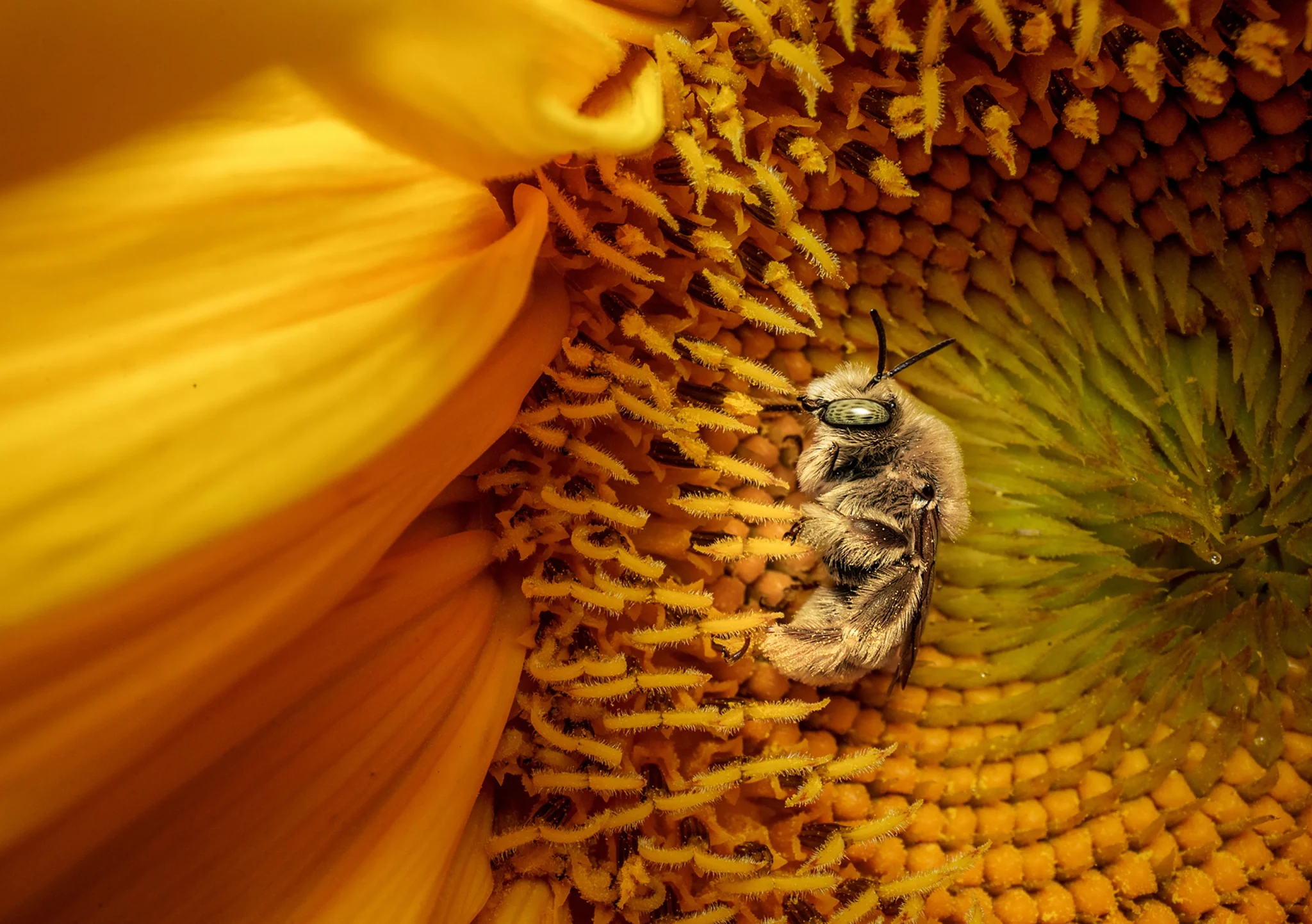 Μια όμορφη, αλλά τεχνικά εξαιρετική λήψη, η οποία δείχνει μια μέλισσα ηλιοτροπίου να ξεκουράζεται μέσα σε έναν ηλιάνθιο, ίσως μετά από μία κουραστική μέρα εργασίας στην επικονίαση των φυτών. Μία υπενθύμιση για τη σημασία των μικρών οργανισμών και για την ισορροπία των οικοσυστημάτων.