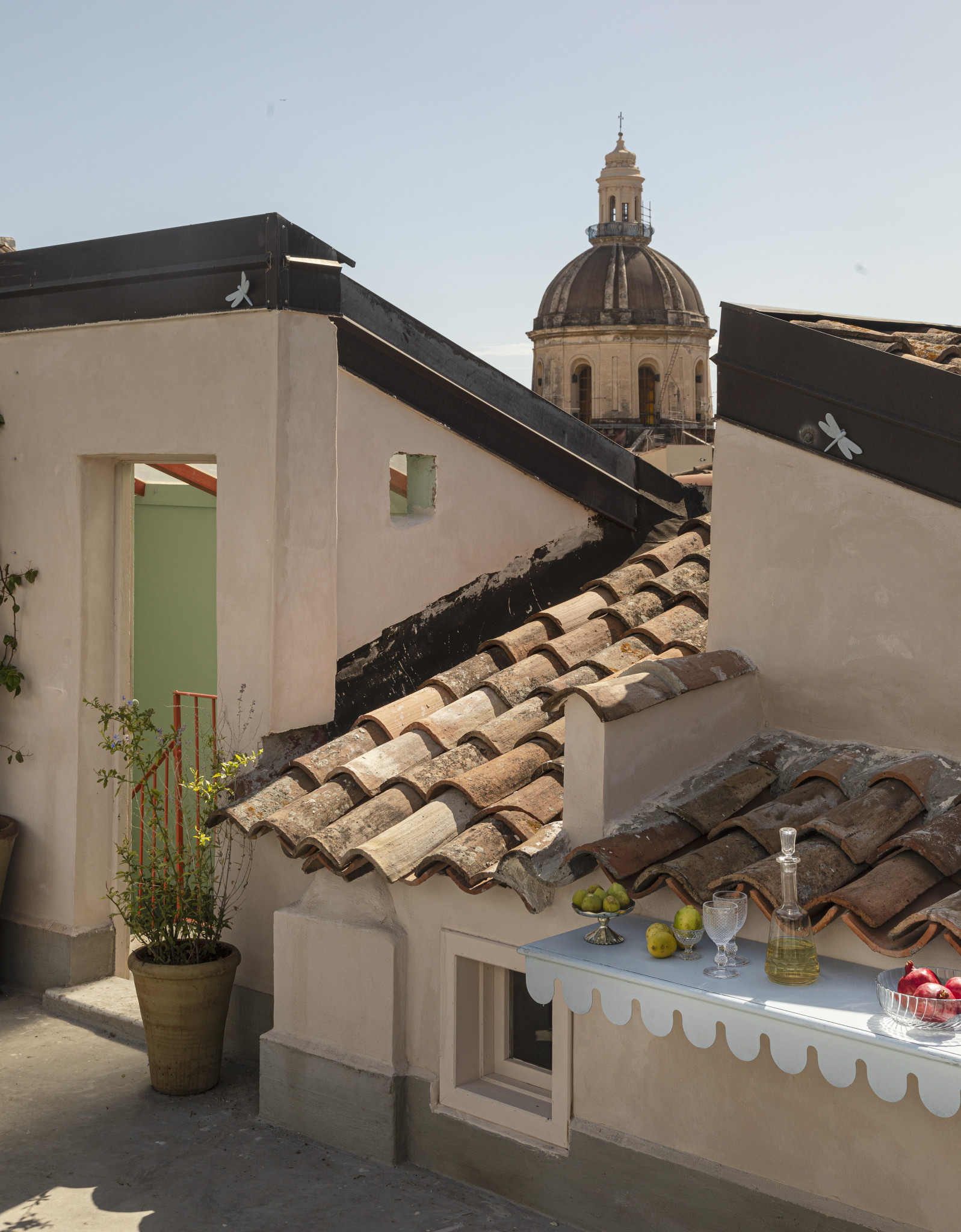 Η πραγματική αποκάλυψη βρίσκεται στο roof garden. Από εκεί ψηλά, η Κατάνια απλώνεται μπροστά στα μάτια σου σαν ένας πίνακας ζωγραφικής, κάνοντας τα πρωινά να μοιάζουν με μικρές τελετουργίες - η στιγμή που η πόλη ξυπνά, κι εσύ βρίσκεσαι στο ιδανικότερο σημείο για να την απολαύσεις. Ο χώρος είναι διακοσμημένος με αυθεντικά κεραμικά, ριγέ υφάσματα σε φίνα παστέλ, λουλούδια και φυτά, ανθοστολισμένα τραπέζια και έπιπλα φτιαγμένα κατά παραγγελία, συνεχίζοντας με αυτόν τον τρόπο τον διάλογο ανάμεσα στο indoor και το outdoor, στην παράδοση και το σήμερα.