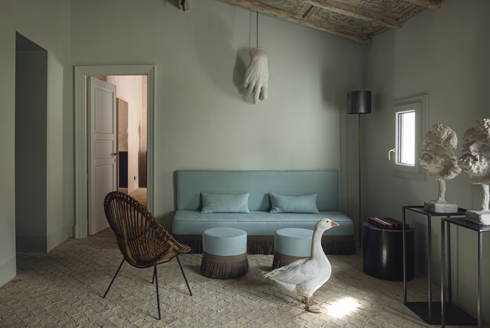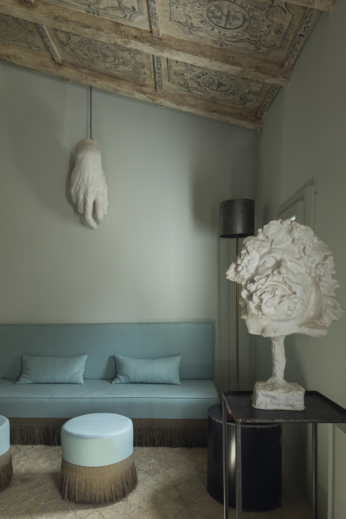 Μια περίτεχνα ζωγραφισμένη οροφή του 18ου αιώνα κλέβει τις εντυπώσεις στη σουίτα Incanto, ξεδιπλώνοντας μοτίβα που θυμίζουν την εμβληματική Galleria degli Uccelli του Palazzo Biscari. Η παστέλ παλέτα και τα custom-made μεταλλικά έπιπλα της Artemest δημιουργούν μια αίσθηση αιώρησης. Το όλο υποβλητικό σκηνικό κάνει τον χρόνο να επιβραδύνεται και σου δίνει την ευκαιρία να παρατηρήσεις όσα υπάρχουν δίπλα σου. Ένα μεγαλοπρεπές μαρμάρινο τζάκι εποχής φέρνει στο μυαλό τις αριστοκρατικές κατοικίες, ενώ η μπανιέρα Antonio Lupi αναπαριστά με κομψή δόση ειρωνείας τα μπάνια του 18ου αιώνα. Τα έπιπλα και τα φωτιστικά, σχεδιασμένα από τον Andrea Perra, συνδυάζουν κλασικότητα και μοντέρνα υπεροχή, ενώ μια επένδυση από γυαλί που χωρίζει το υπνοδωμάτιο από το μπάνιο εισάγει ένα ακόμα στοιχείο μοντερνισμού.