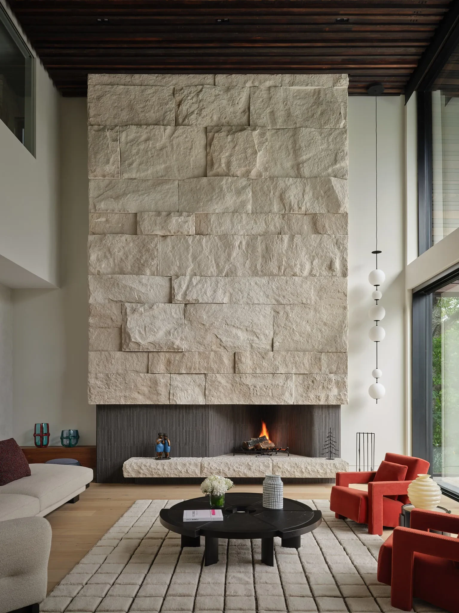 Στο εσωτερικό, οι χώροι αποκτούν τη δική τους γλυπτική έκφραση, με μια αίσθηση ανοιχτότητας που παραπέμπει έμμεσα σε θολωτές οροφές της Μέσης Ανατολής. Το δάπεδο της εισόδου, όπου μαύρο μάρμαρο Sahara Noir ενσωματώνεται σε σανίδες δρυός, λειτουργεί ως ανάμνηση της προγονικής εστίας. Ο ενιαίος χώρος καθιστικού προσφέρει μια εμπειρία χαλάρωσης που αγκαλιάζει τον επισκέπτη, με επίκεντρο έναν καναπέ Extrasoft της Living Divani, επενδυμένο με φυσικό δέρμα, σχεδιασμένο να «ανοίγεται» προς το τζάκι, την κουζίνα και τη λίμνη.