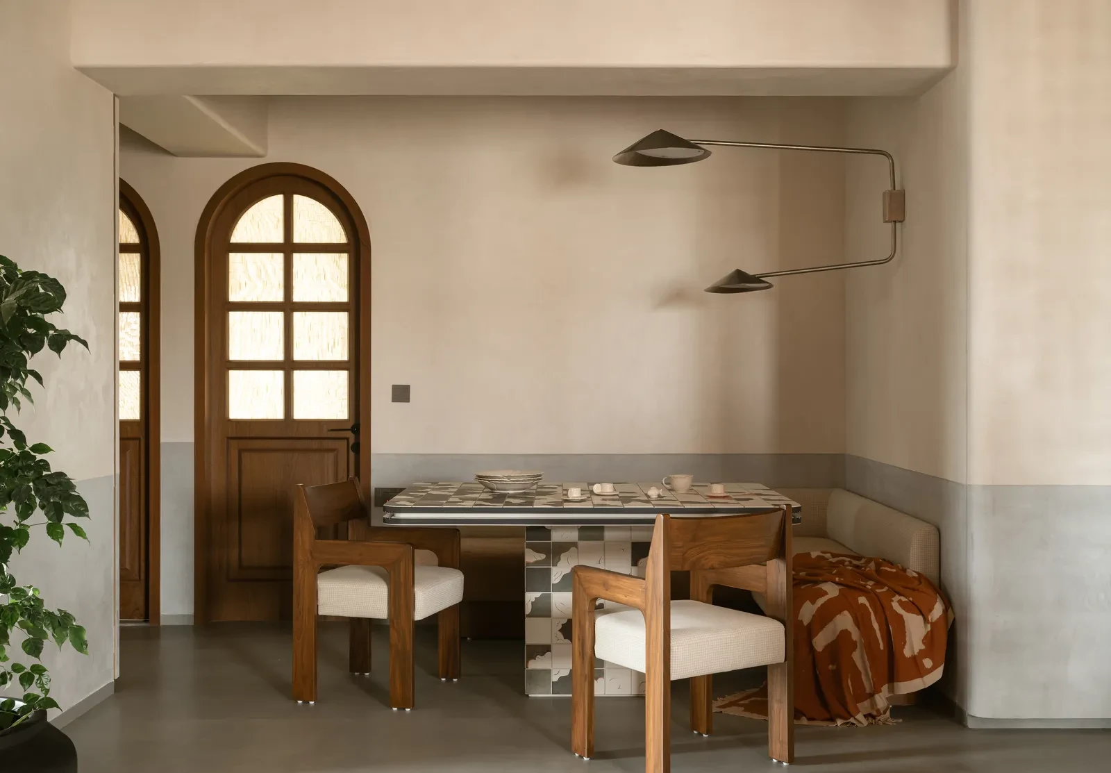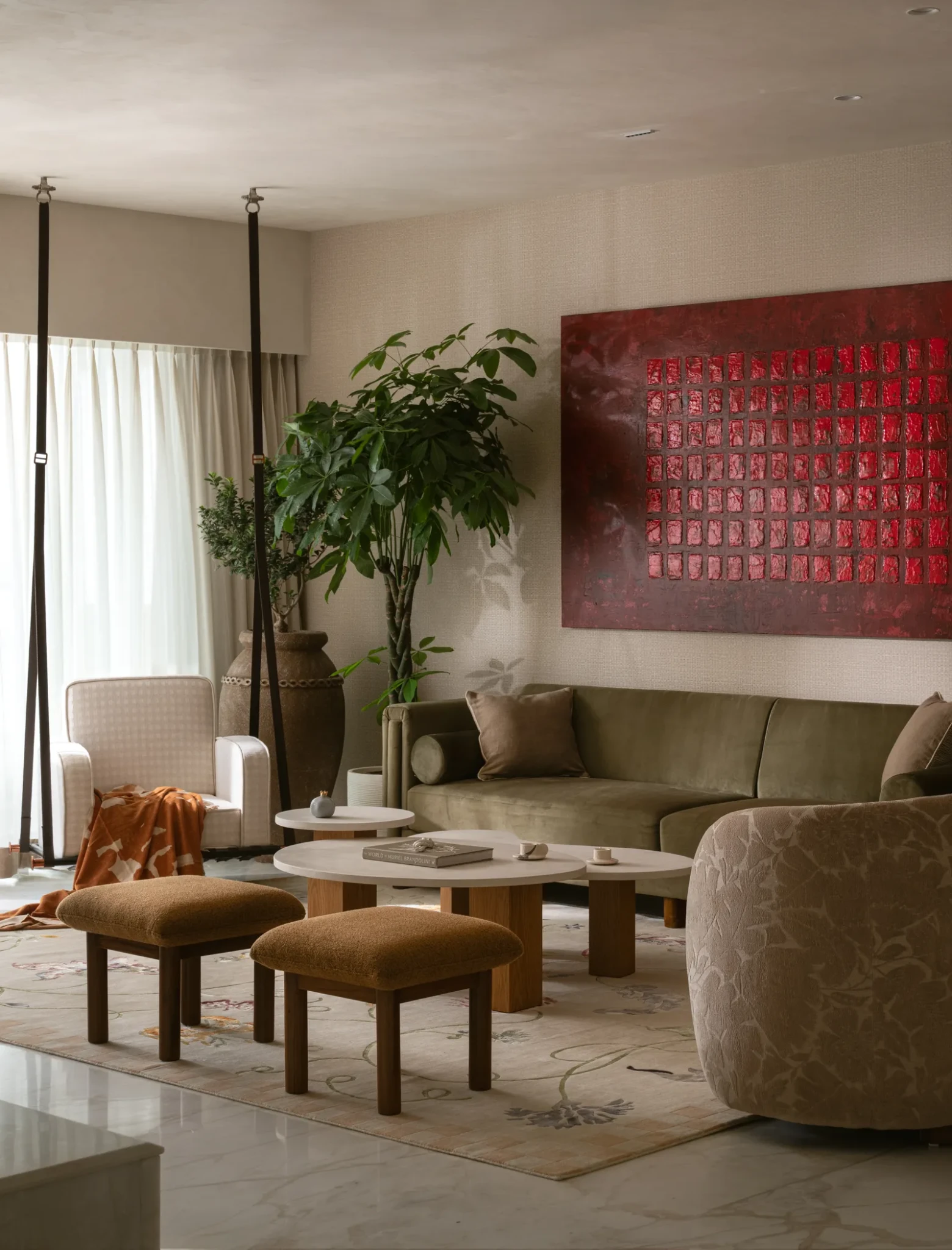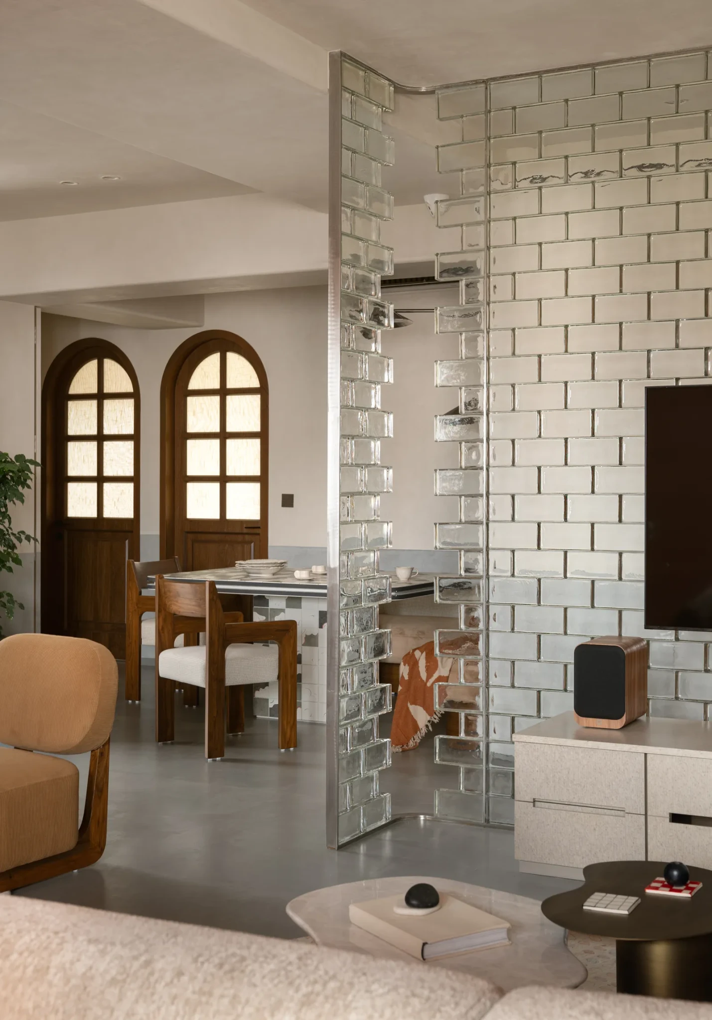 Ένα λεπτό χαλί που αποτυπώνει την ιαπωνική χλωρίδα συμπληρώνεται αρμονικά από το βελούδινο καναπέ στο χρώμα της ελιάς. Ξύλινα έπιπλα και φυτά που συμφωνούν με το feng shui ζεσταίνουν περισσότερο το χώρο. Ο ημιτελής τοίχος από διαφανή υαλότουβλα συνδέει αρμονικά με έναν ιδιαίτερο τρόπο το καθιστικό με την τραπεζαρία. Τα ξύλινα αντικείμενα και οι πλούσιες υφές σε συνδυασμό με τα απαλά υφάσματα καθορίζουν μια ήρεμη συνολική αισθητική. Το επίκεντρο της τραπεζαρίας είναι φυσικά το τραπέζι με το χρυσό φινίρισμα από μέταλλο, το οποίο και οριοθετεί το χώρο του γονέα από το χώρο του παιδιού.