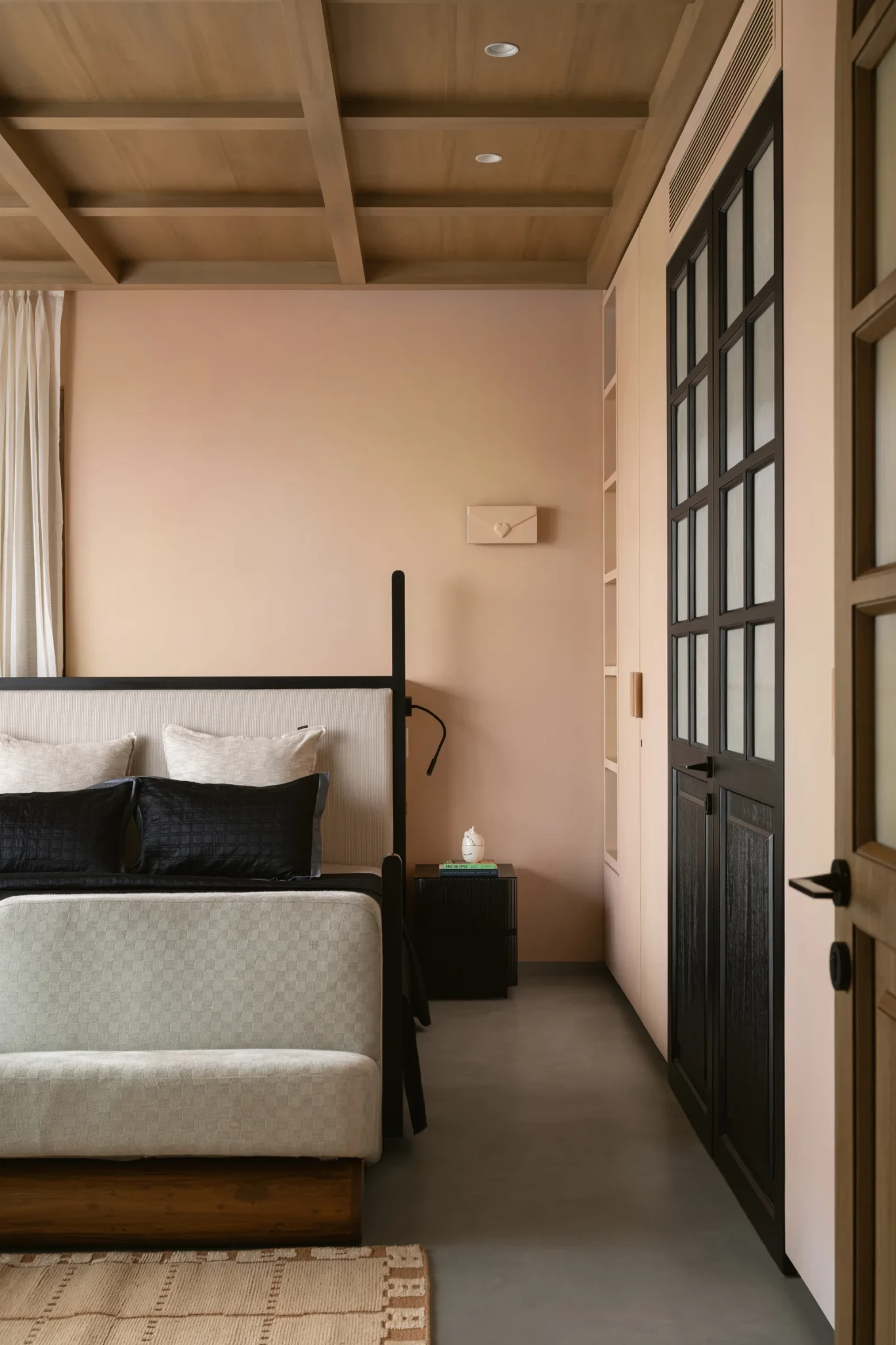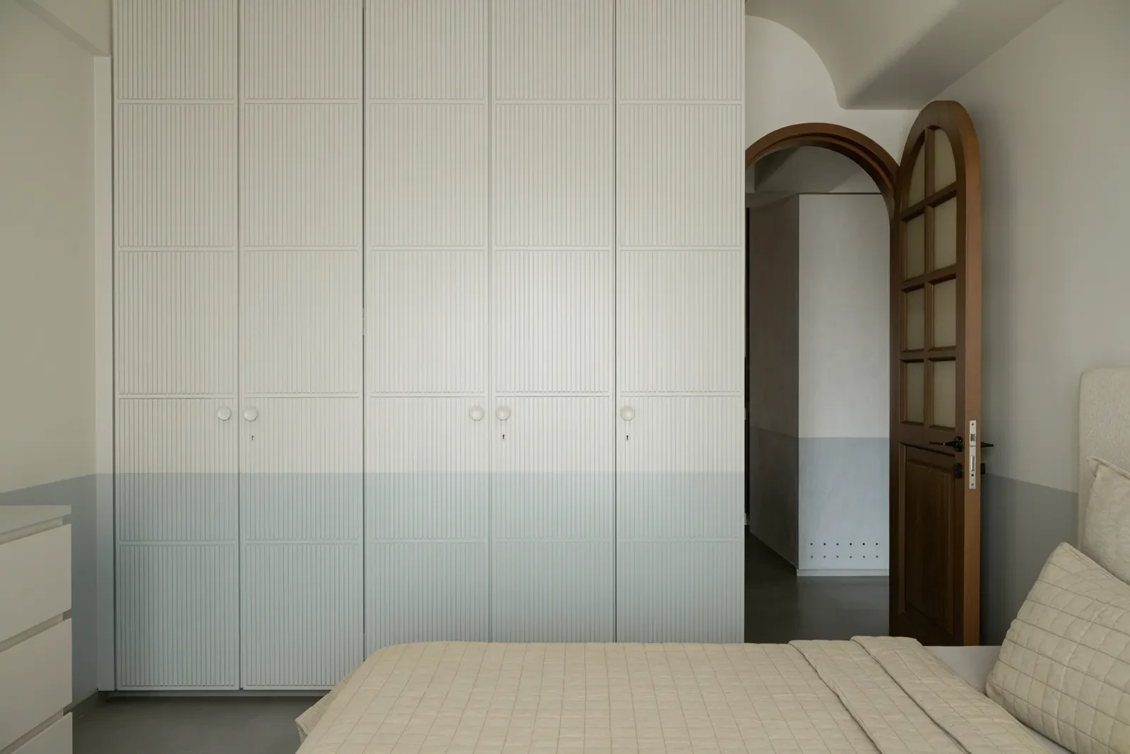 Στο κεντρικό υπνοδωμάτιο των γονιών οι ήπιοι και μπεζ τόνοι συνεχίζονται. Το ξύλινο κρεβάτι αποτελεί το κεντρικό στοιχείο του δωματίου, ενώ τα φωτιστικά πάνω από τα διακριτικά κομοδίνα, αντιπροσωπεύουν τη σχέση της μητέρας και του παιδιού.