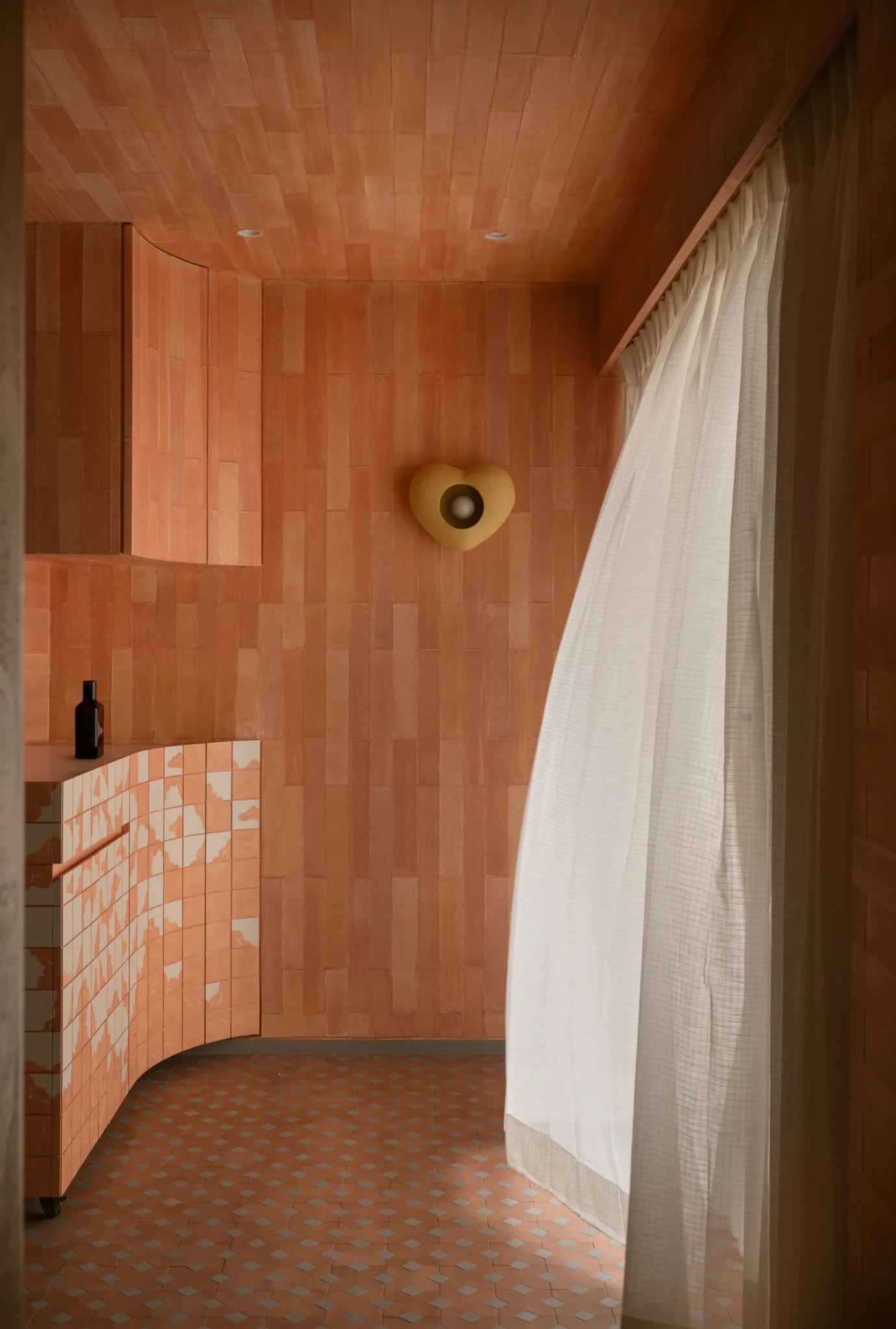 Στο παιδικό δωμάτιο το κρεβάτι αποτελεί το κεντρικό στοιχείο του χώρου, ενώ το ξύλινο ταβάνι και το καμπυλωτό παράθυρο πλαισιώνουν αρμονικά τη θέα στο δέντρο Champa. Το μπάνιο και ο πάγκος του ντύνονται από ροδακινί, ανάγλυφα πλακάκια και έρχονται σε αντίθεση με το υπόλοιπο σπίτι, ενώ η επιτοίχια λάμπα σε σχήμα καρδιάς θυμίζει σε σχεδιασμό και εναρμονίζεται με αυτό που βρίσκεται στο μπάνιο.